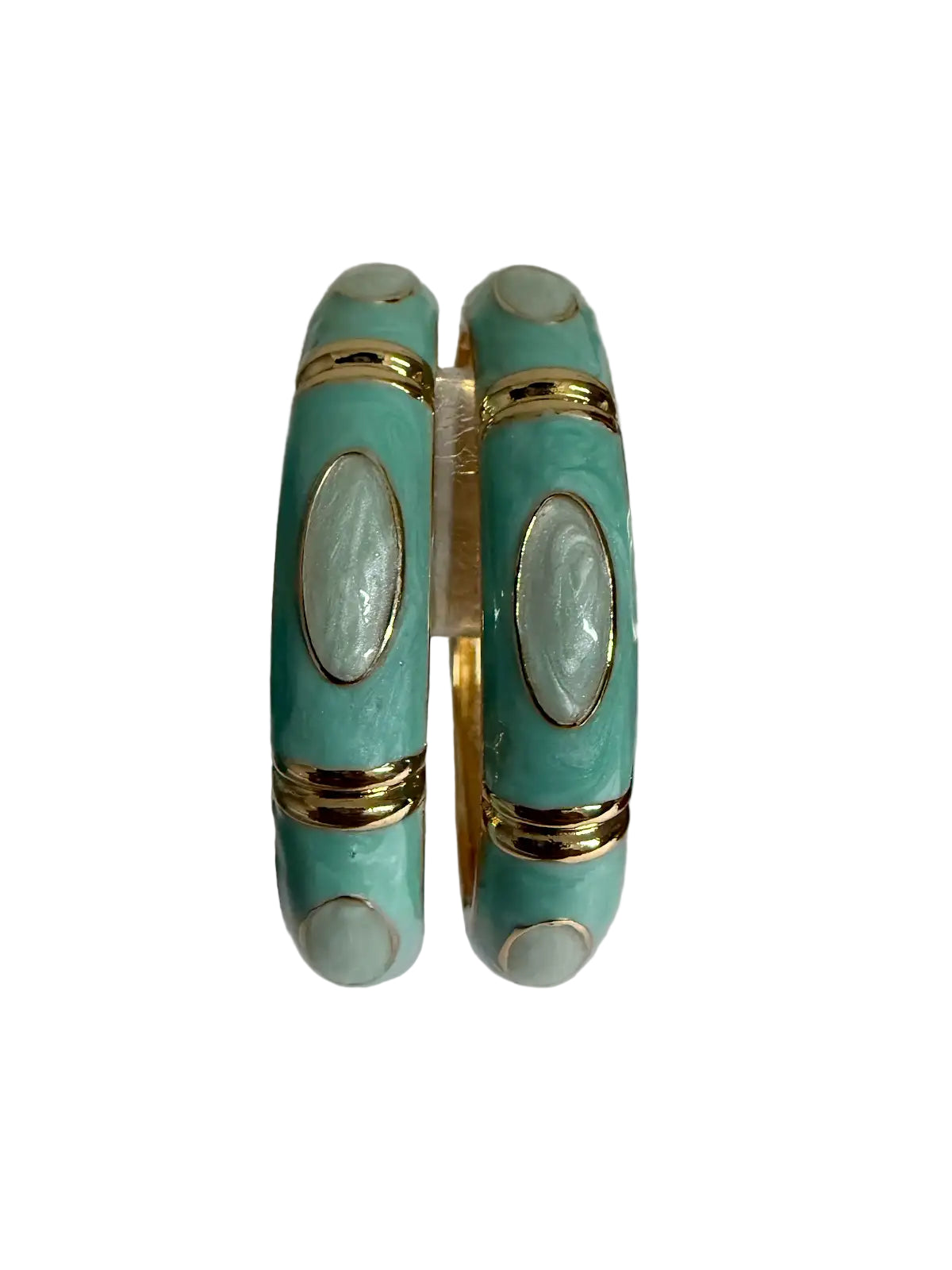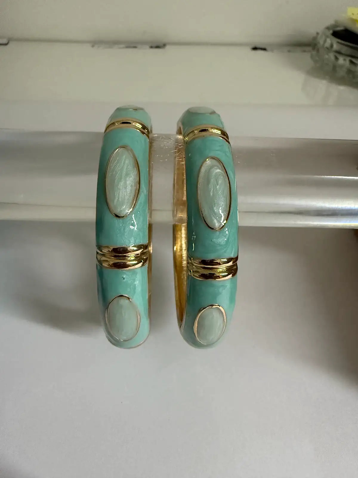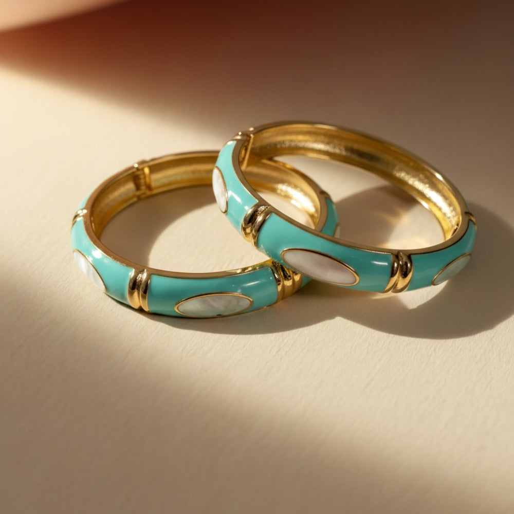 A chic golden kada featuring delicate light blue enamel with elegant oval accents, designed with a secure hinged closure and a sturdy, easy-to-use clasp for a comfortable fit.  Blending soft hues with practical design, it adds a refreshing touch to any wrist.  Lightweight yet eye-catching, perfect for both everyday wear and...