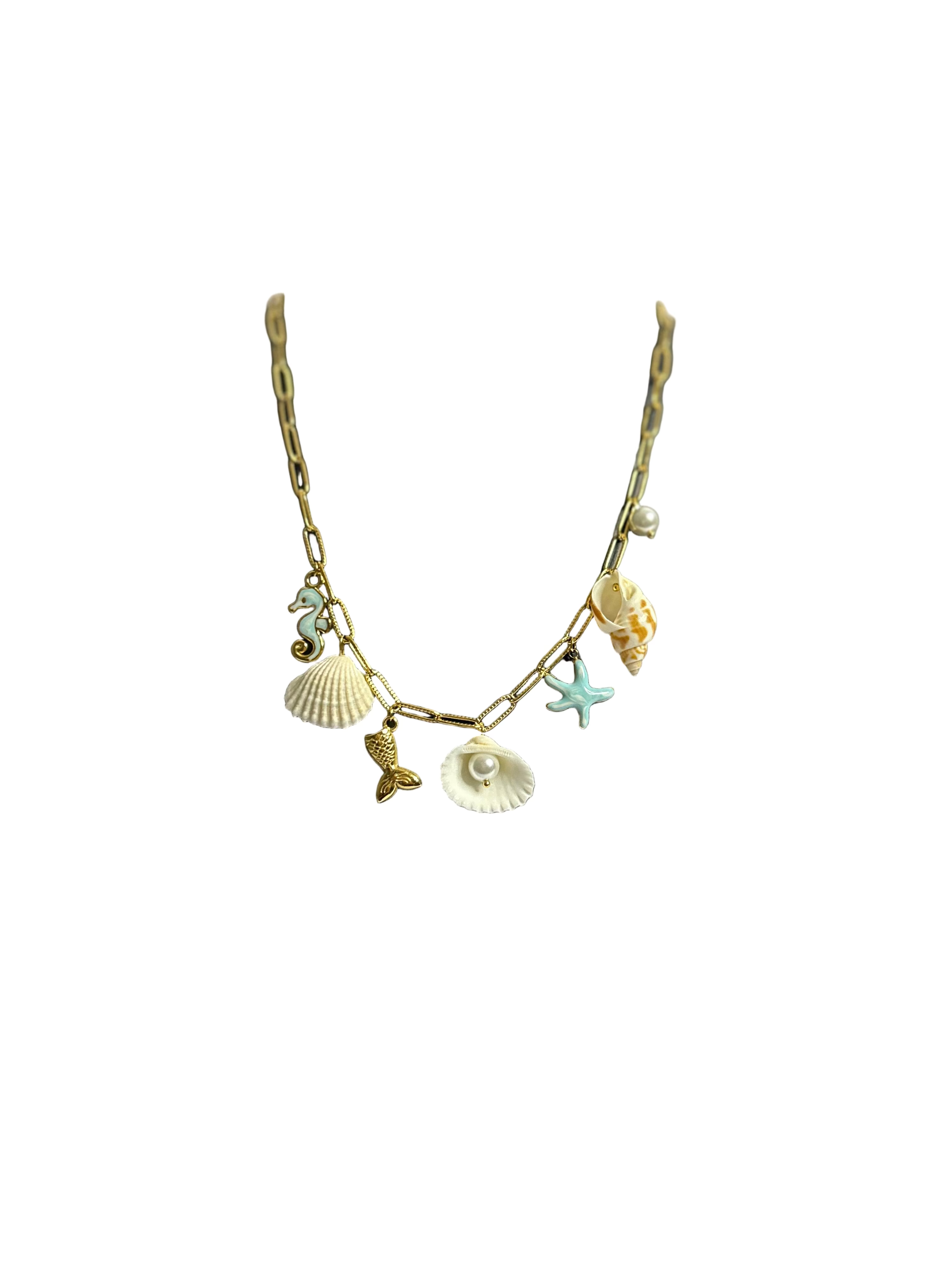 Features ocean-inspired charms: seahorse, shells, starfish & mermaid tail. Accented with elegant pearls and glossy gold finish Lightweight, airy design perfect for vacations and beach parties Trendy paperclip-style gold chain with a summer glow