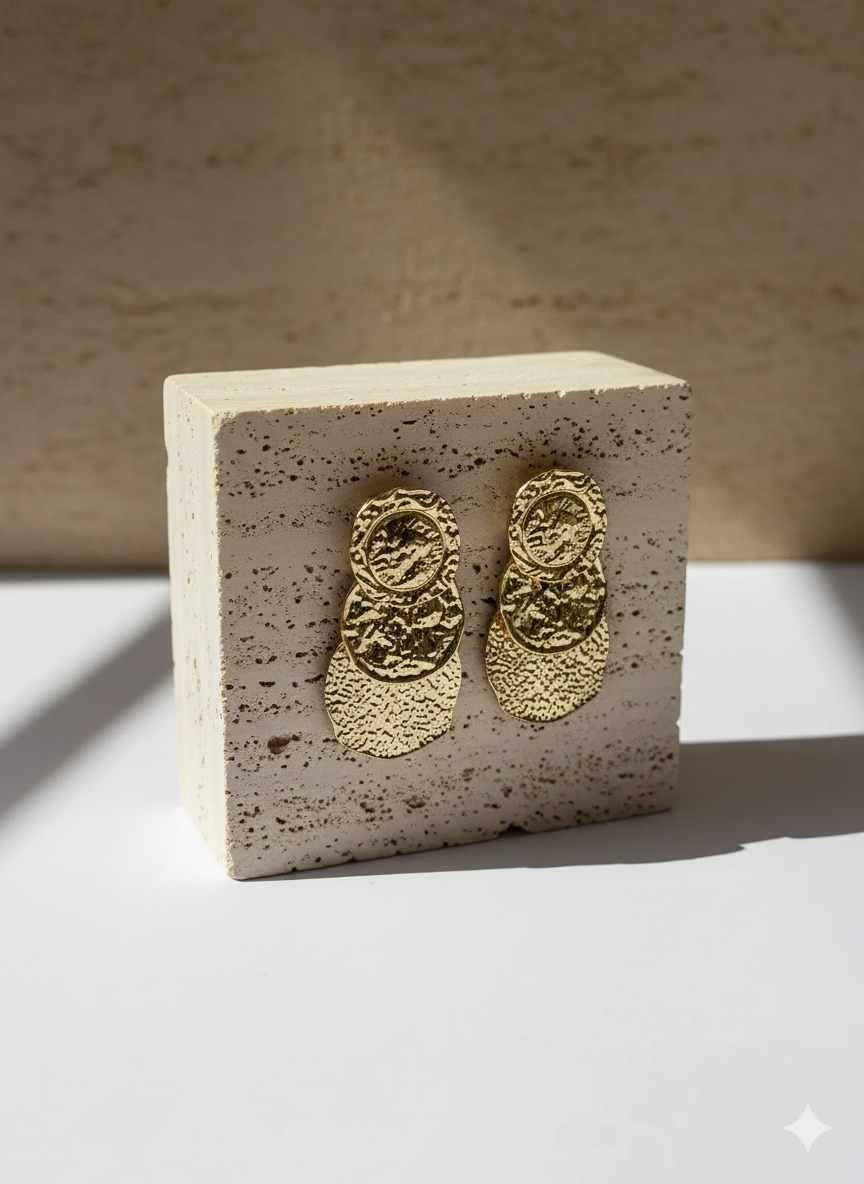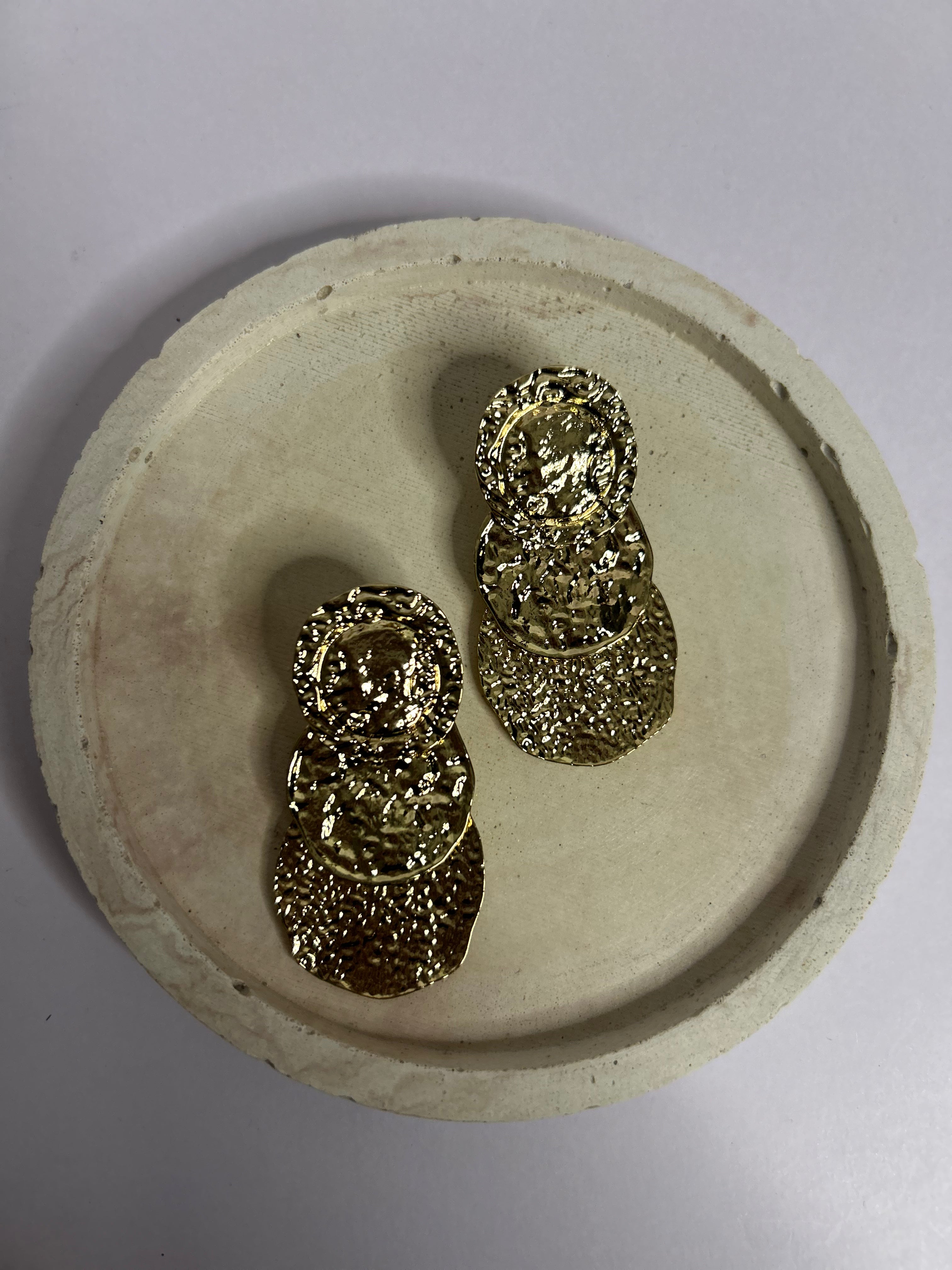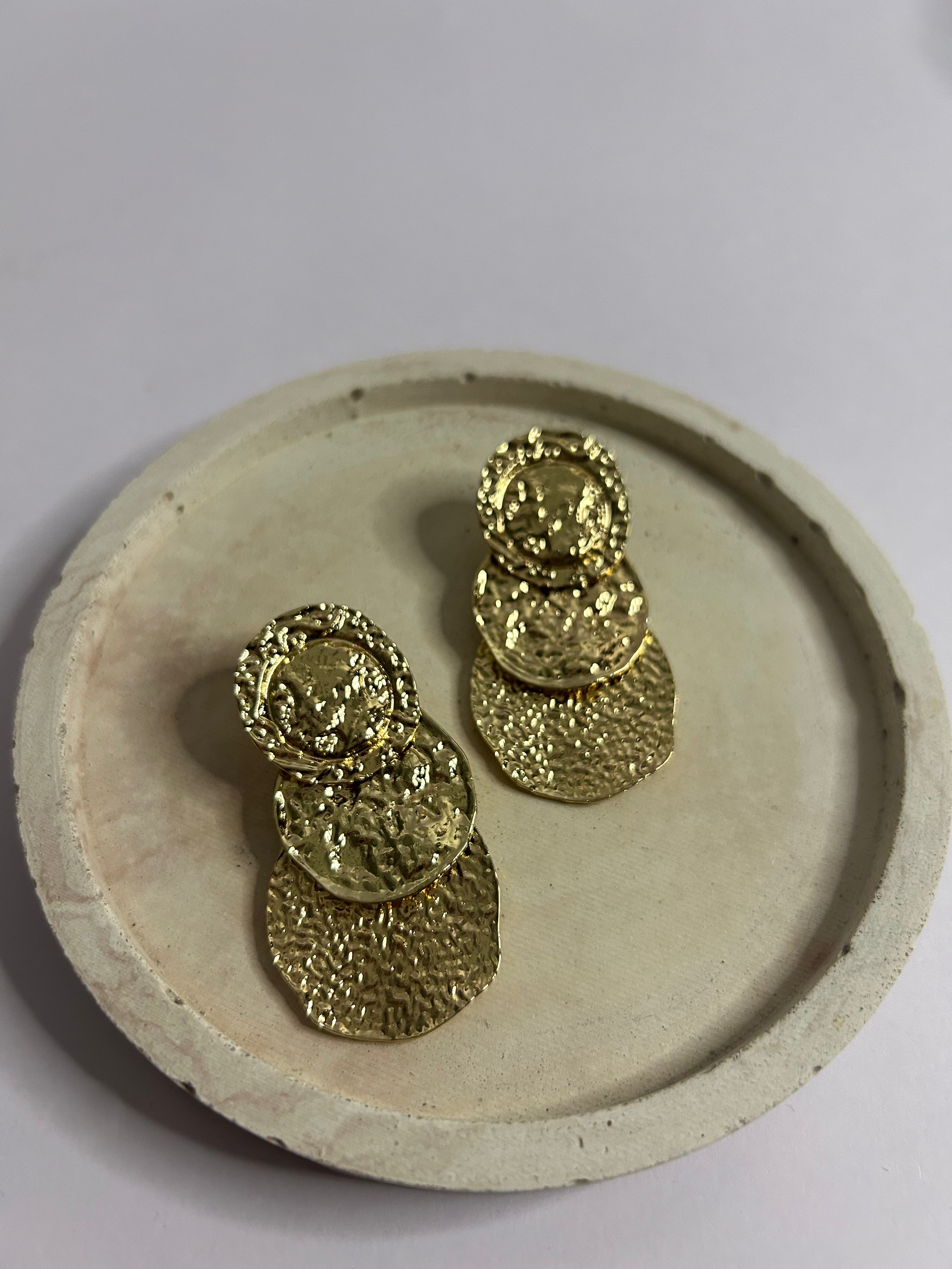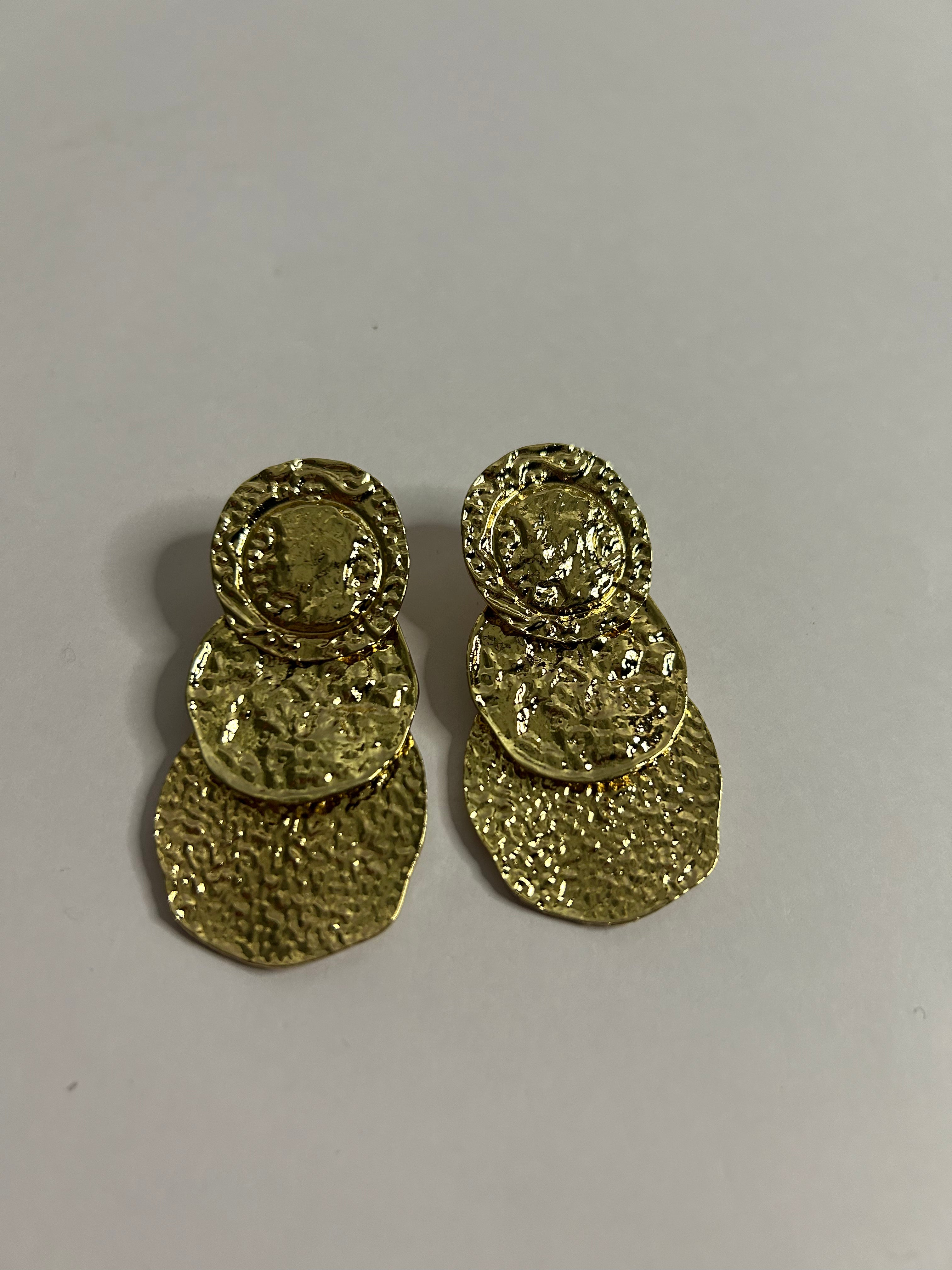 Unique earrings featuring three beaten gold coins with a textured, handcrafted look.  Crafted from premium materials for a rich, enduring golden sheen.  Comfortable to wear all day, adding a subtle vintage vibe to your style.  Versatile accessory that pairs beautifully with casual, work, or evening attire.