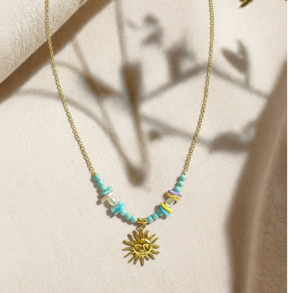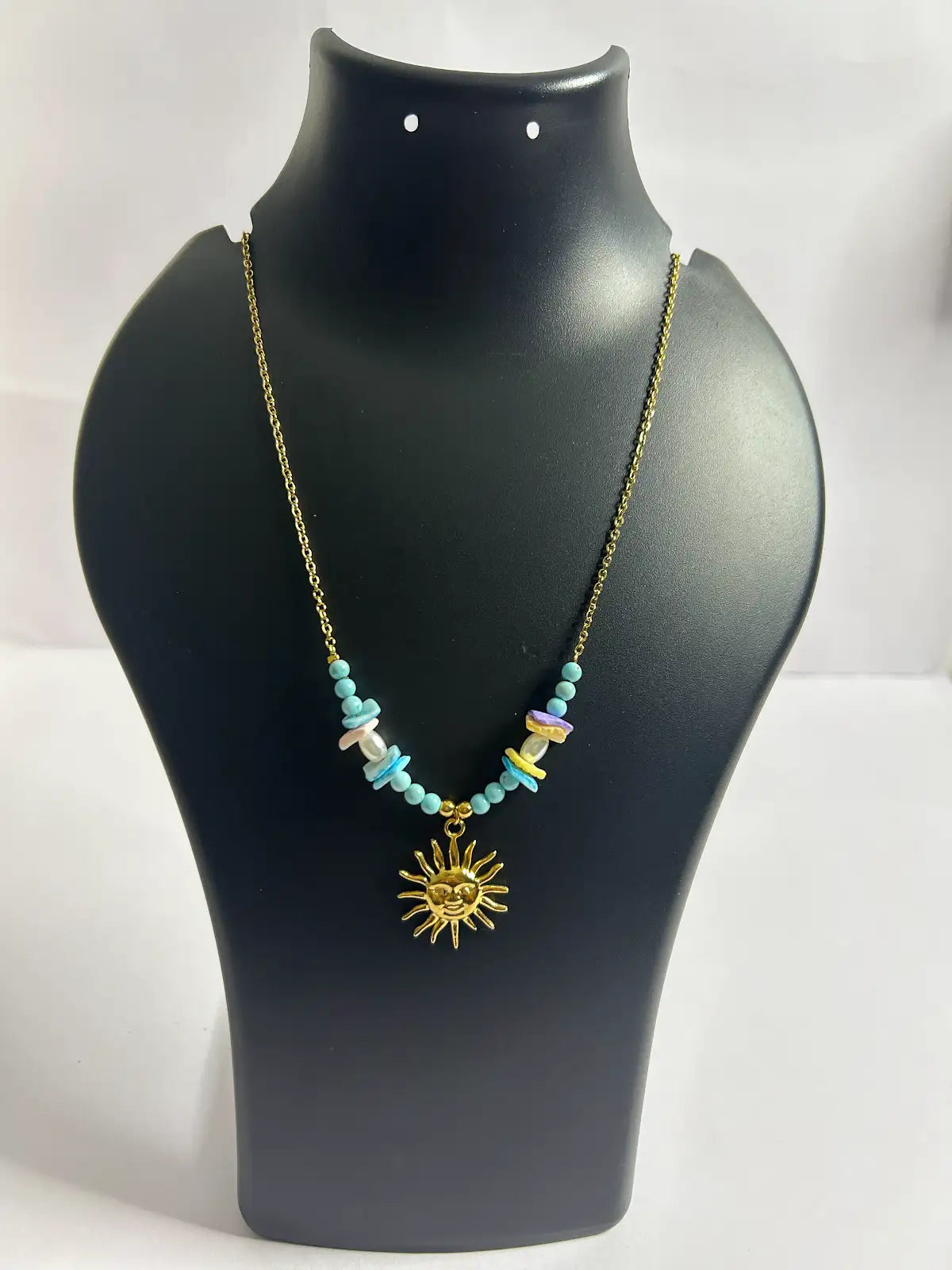 A delicate gold chain with a radiant sun pendant and soft blue beads. Bright and cheerful design that adds a pop of color and warmth. Lightweight and comfortable for everyday wear or special occasions.