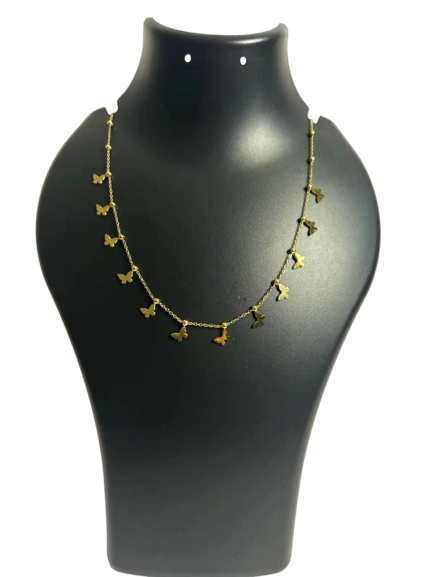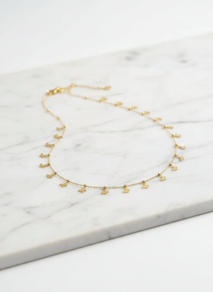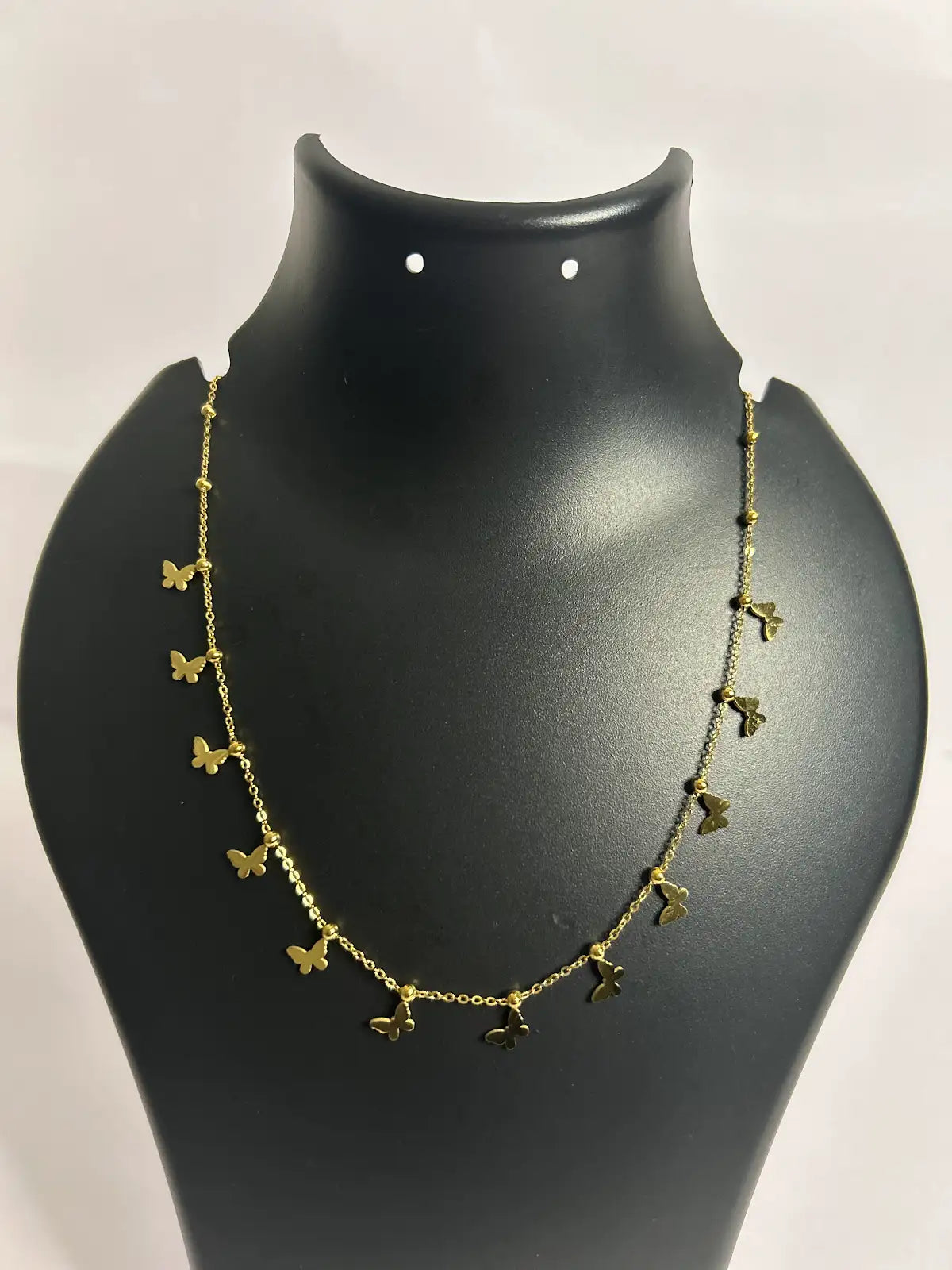 Delicate golden chain with shining butterfly charms that bring warmth and love. A classic piece that adds a soft glow to any outfit, casual or dressy. Lightweight and easy to wear all day, perfect for layering with others.