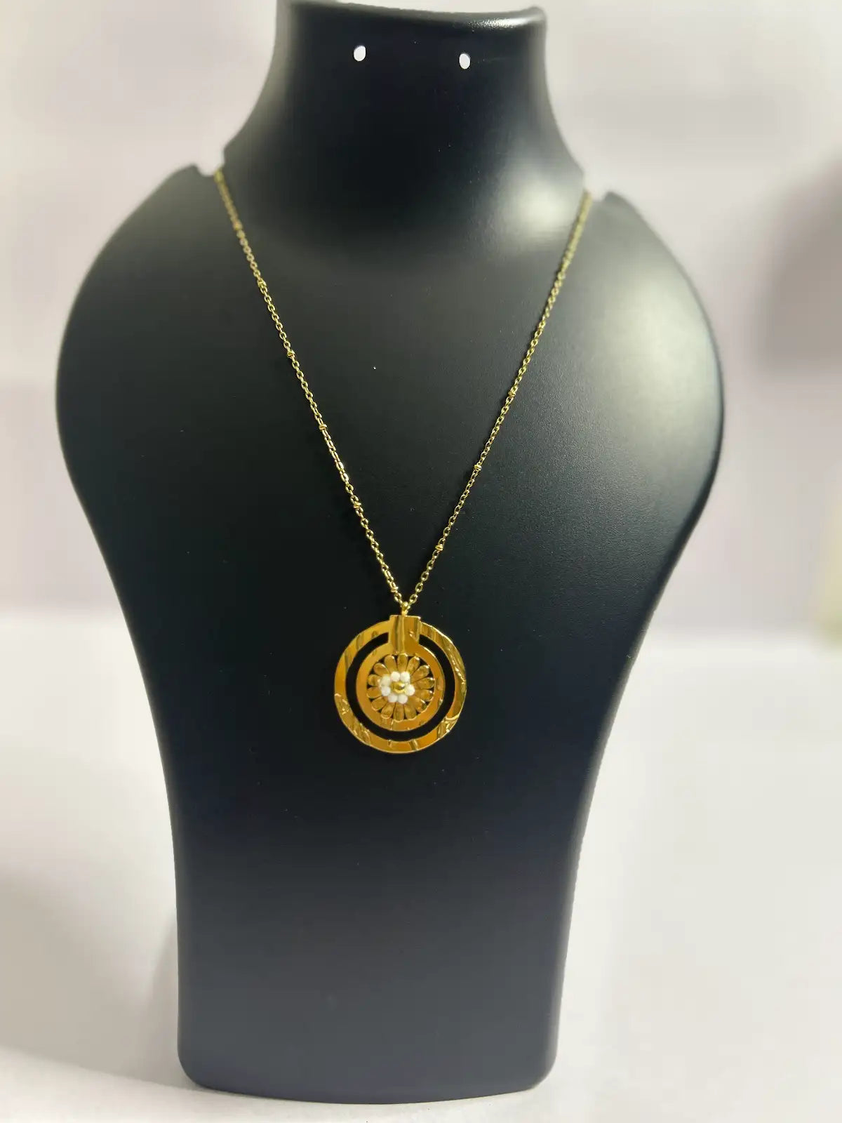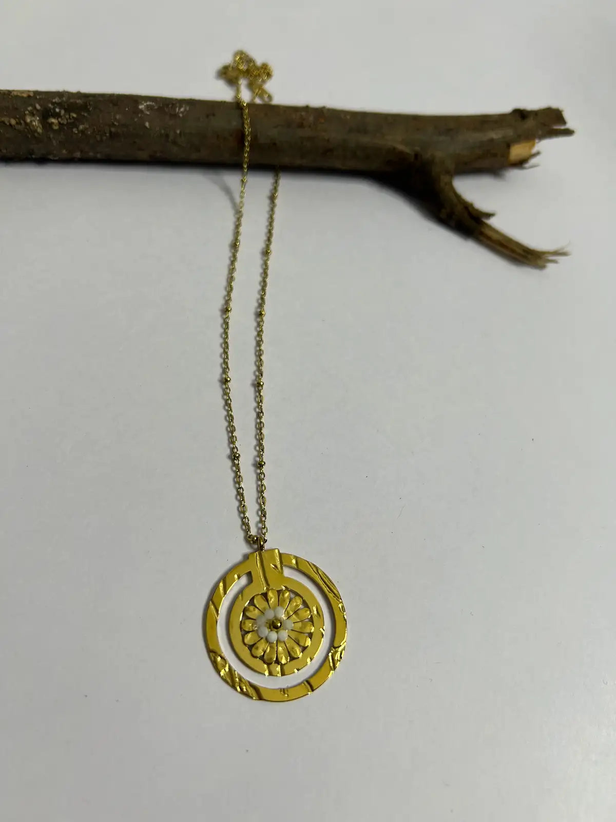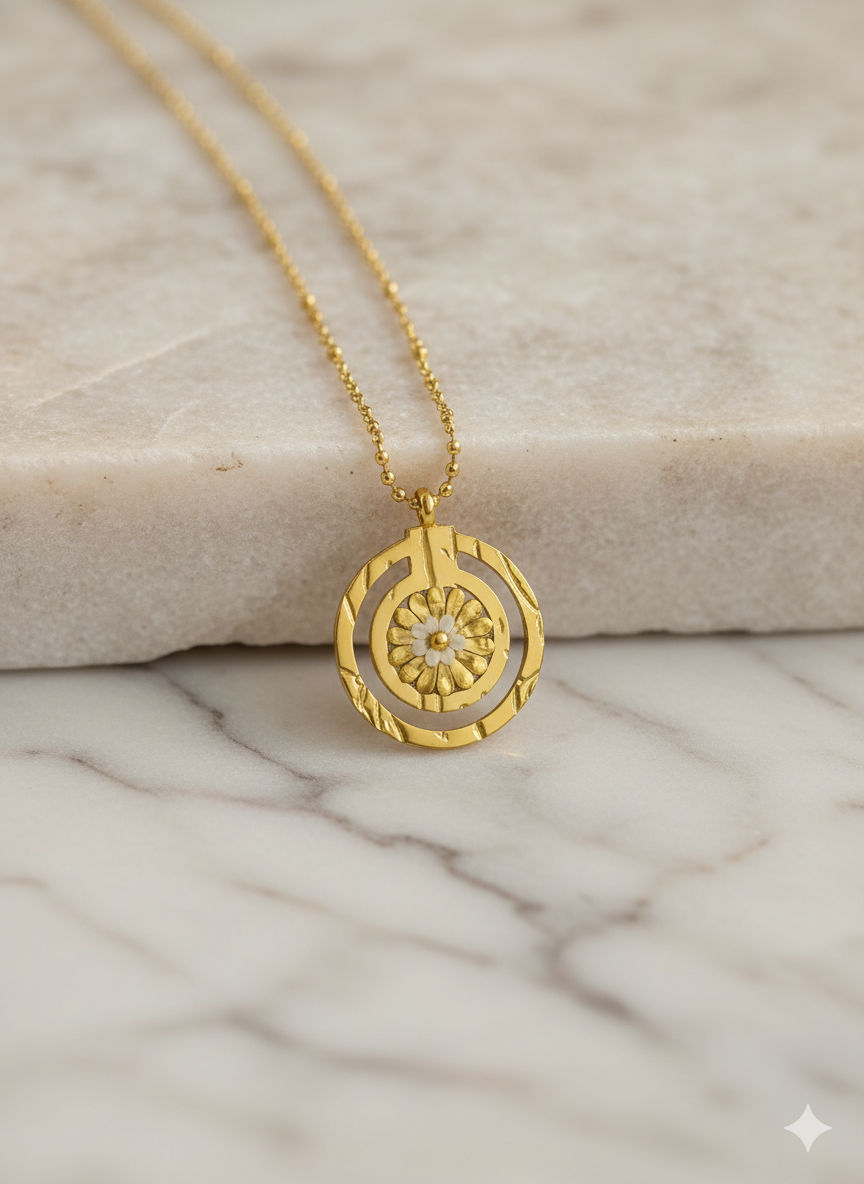 Gleaming golden circle frame with a delicate white flower centerpiece on a sleek gold chain. Lightweight design perfect for layering or as a standout solo piece. Versatile enough for casual wear or evening elegance.