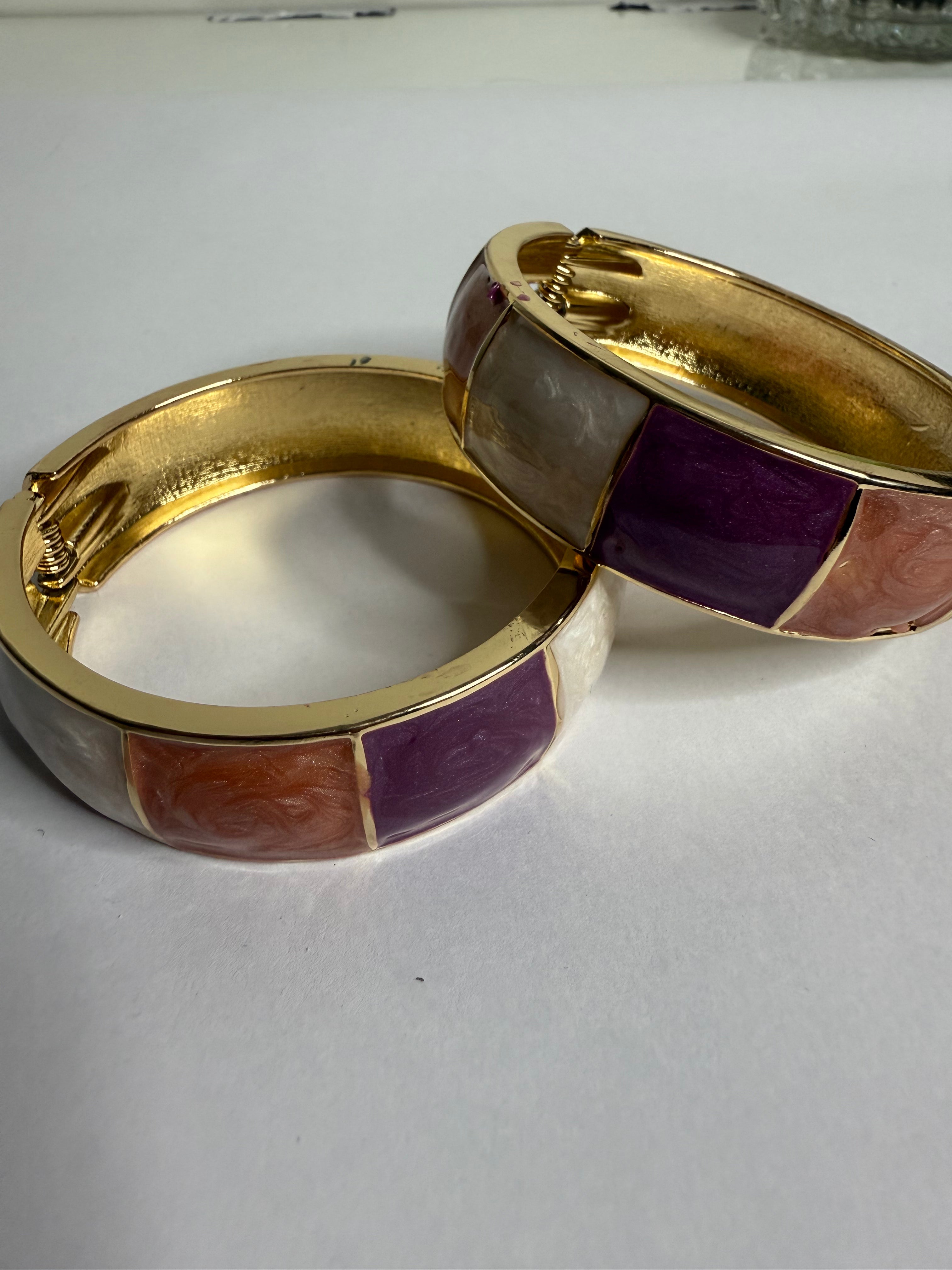 A vibrant enamel bracelet featuring orange, purple, and ivory colored tiles, designed with a secure hinged closure and a sturdy, easy-to-use clasp for a snug fit. Combining bold colors with comfortable functionality, it adds a playful yet elegant touch to any wrist. Broad and lightweight, perfect for making a statement while maintaining...