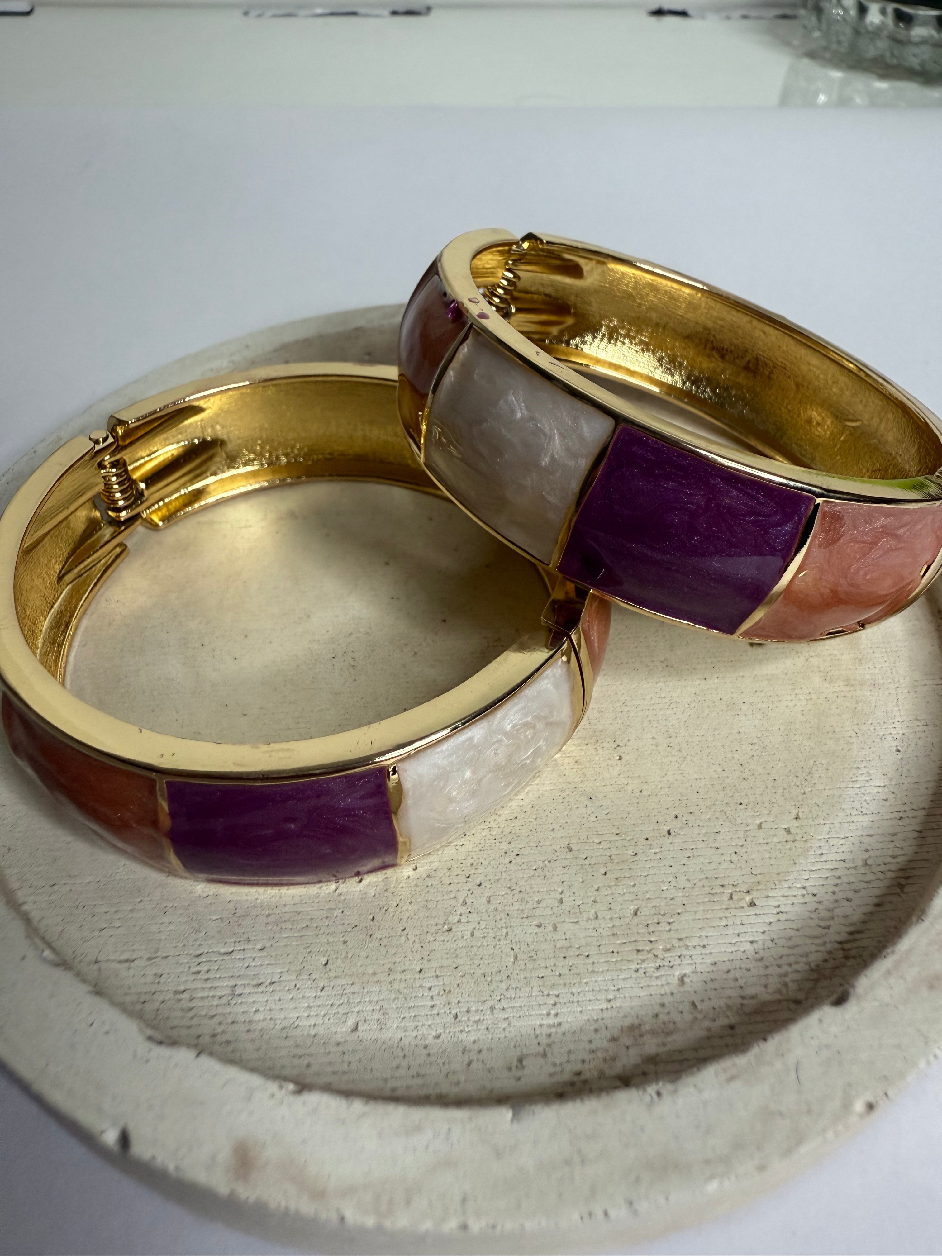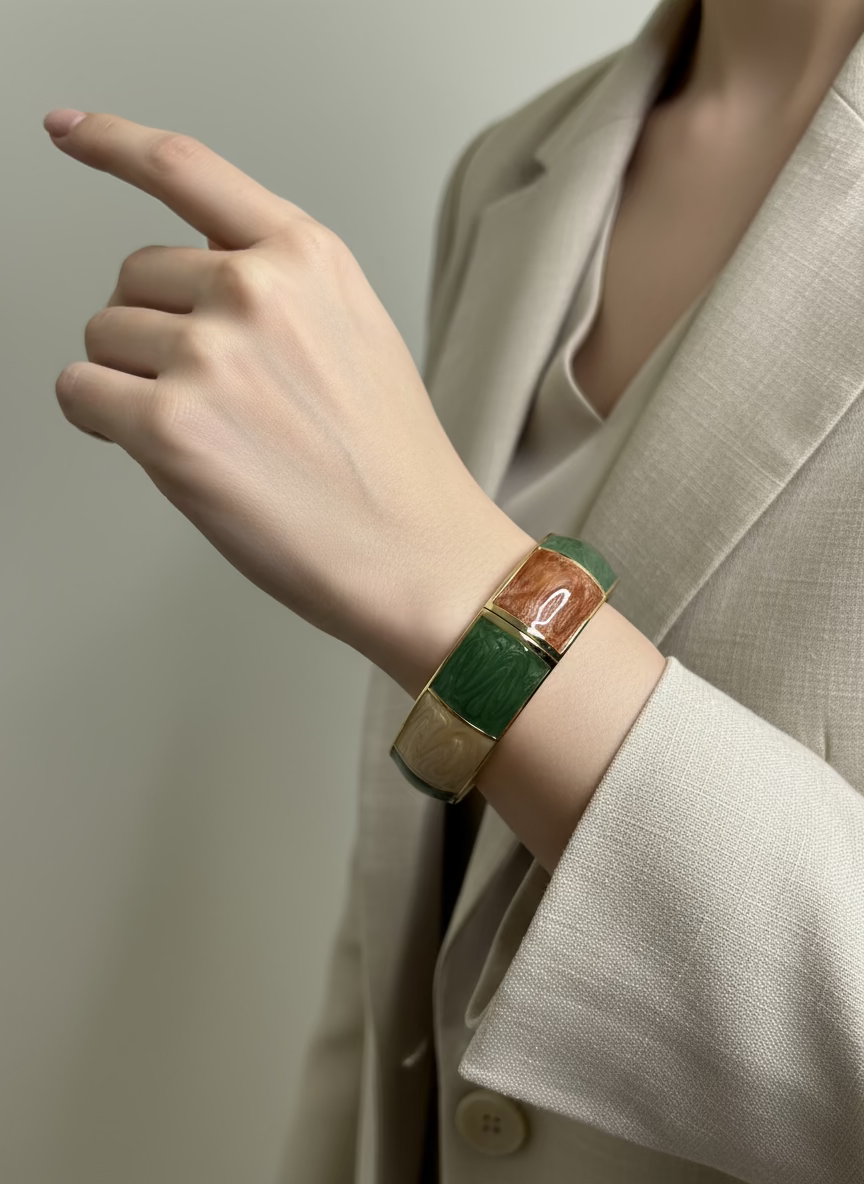 A vibrant enamel bracelet featuring green, orange, and ivory colored tiles, designed with a secure hinged closure and a sturdy, easy-to-use clasp for a snug fit. Combining bold colors with comfortable functionality, it adds a playful yet elegant touch to any wrist. Broad and lightweight, perfect for making a statement while maintaining...