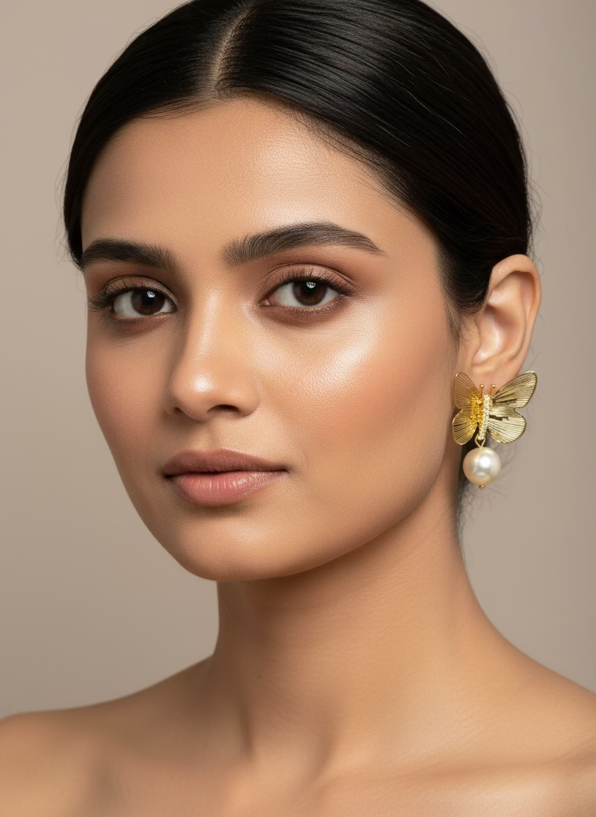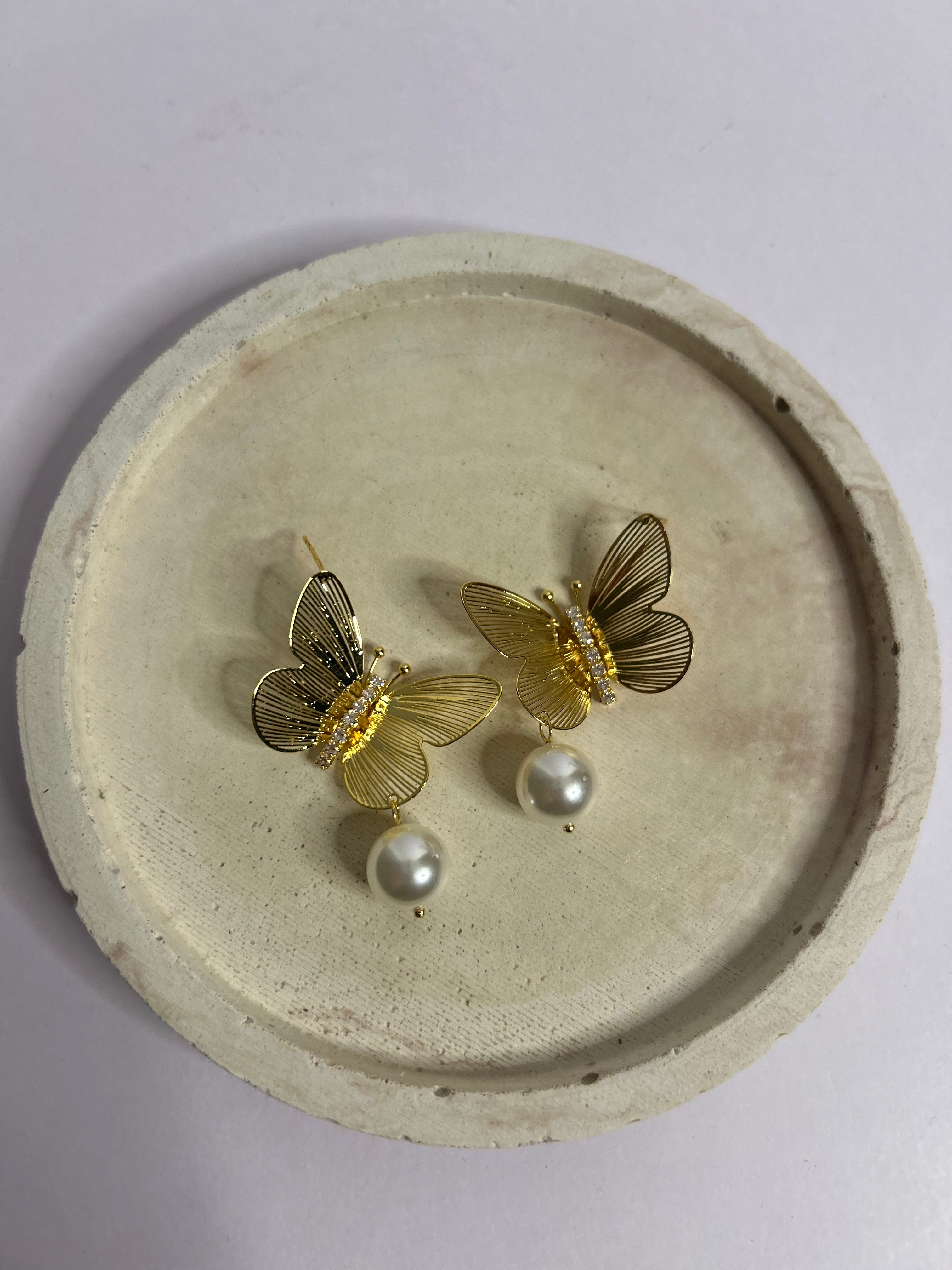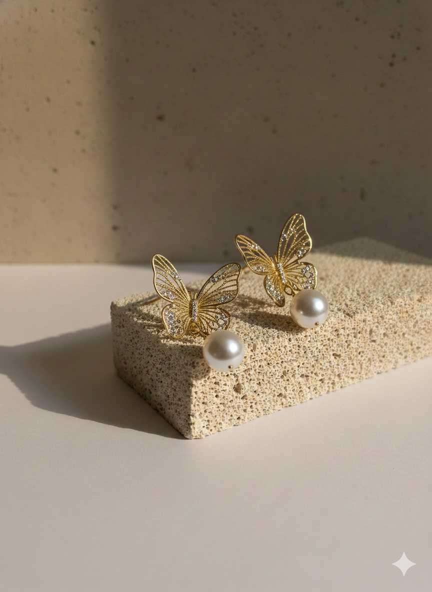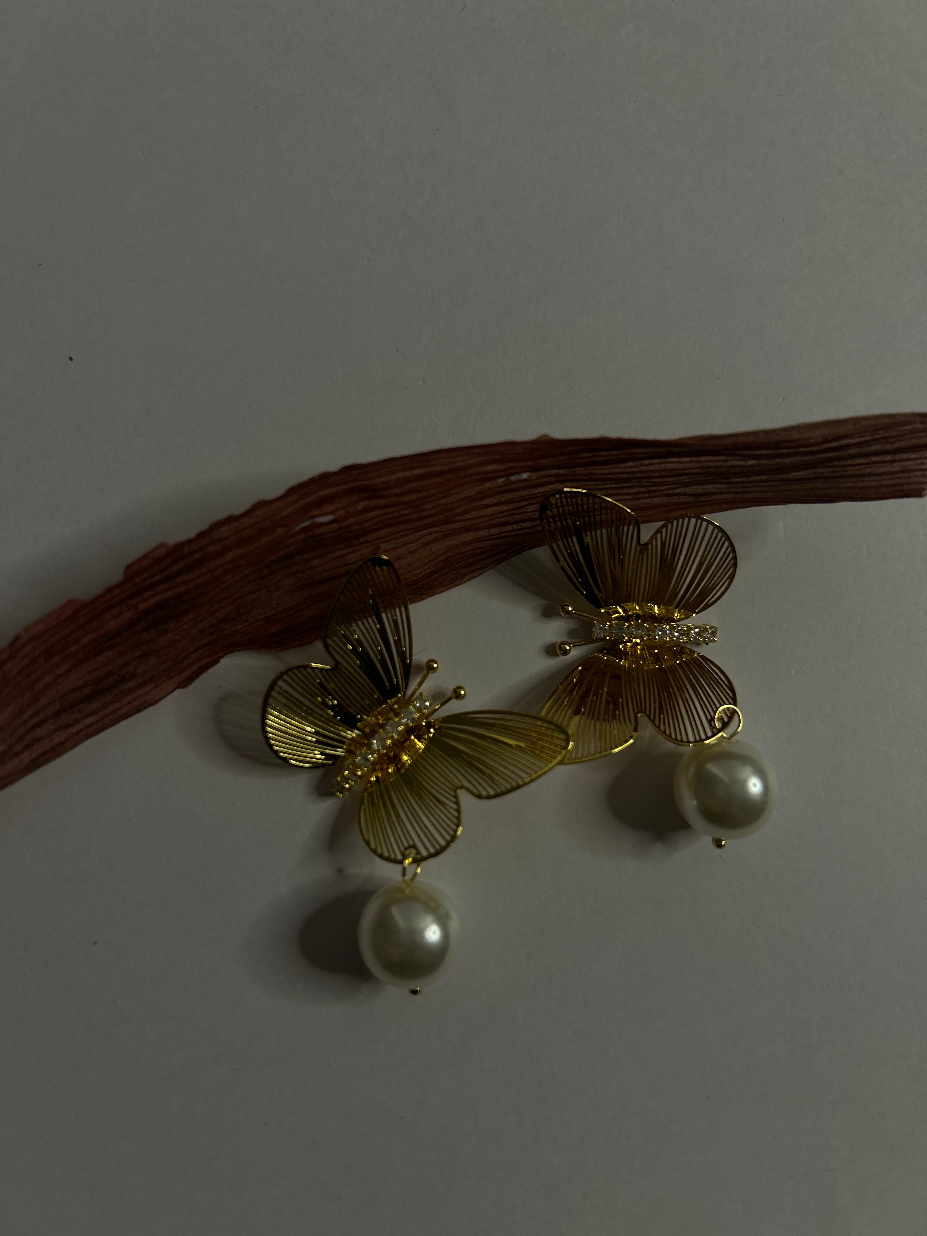 Graceful earrings featuring a delicate butterfly design complemented by a single, elegant hanging pearl that moves with every gesture. Crafted with premium materials for a radiant golden finish and lasting durability.  The dangling pearl adds a dynamic, sophisticated touch, enhancing the lightness and charm of the butterfly motif.  Perfectly designed for special occasions...