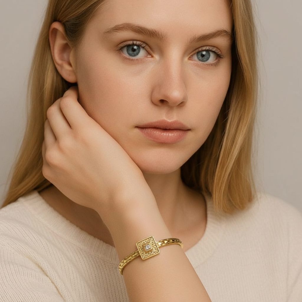 Features a beautifully textured square centerpiece with a sparkling diamond set in the middle  Available in fixed sizes: 2.6 and 2.8 inches in diameter (refer to bracelet size chart for a perfect fit)  A sophisticated and modern accessory ideal for both everyday wear and special occasions  Makes a striking statement piece that enhances...