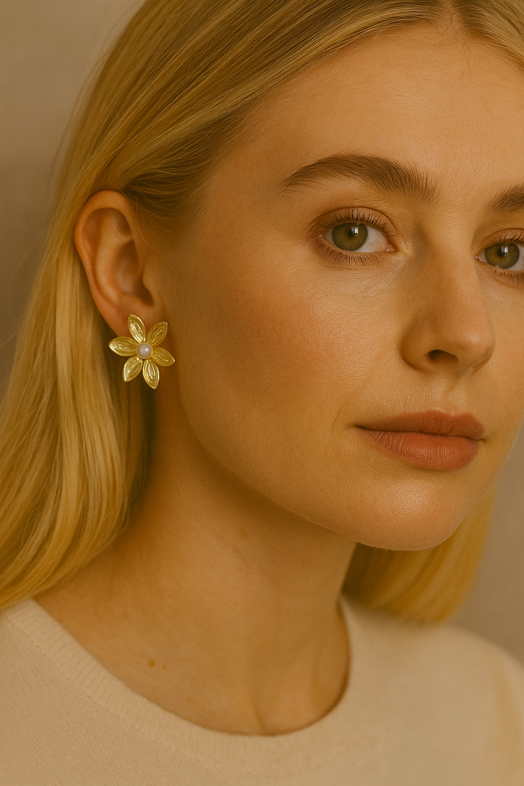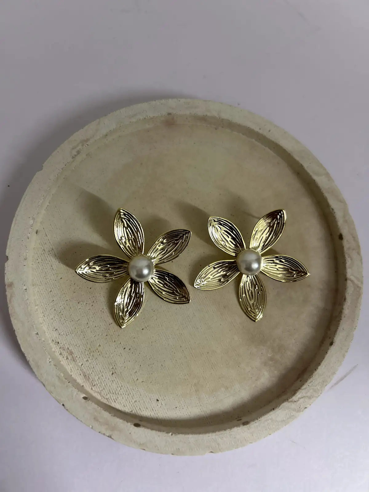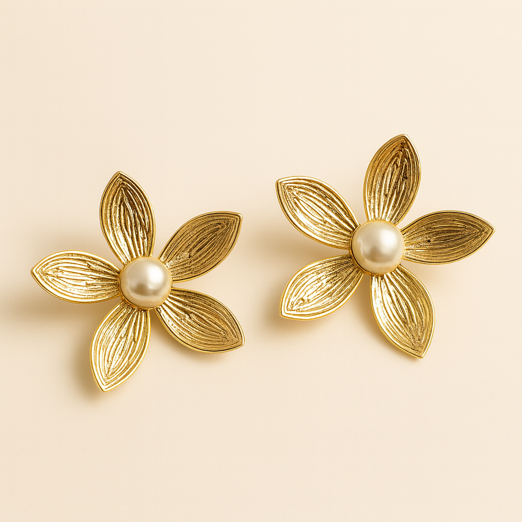 Sophisticated earrings featuring a beautifully crafted lined flower design with a pearl gracefully positioned at the center.  Made from high-quality materials to ensure a radiant golden finish that lasts.  The intricate lines of the flower add texture and depth, complementing the classic elegance of the central pearl.  Lightweight and designed for comfortable wear,...