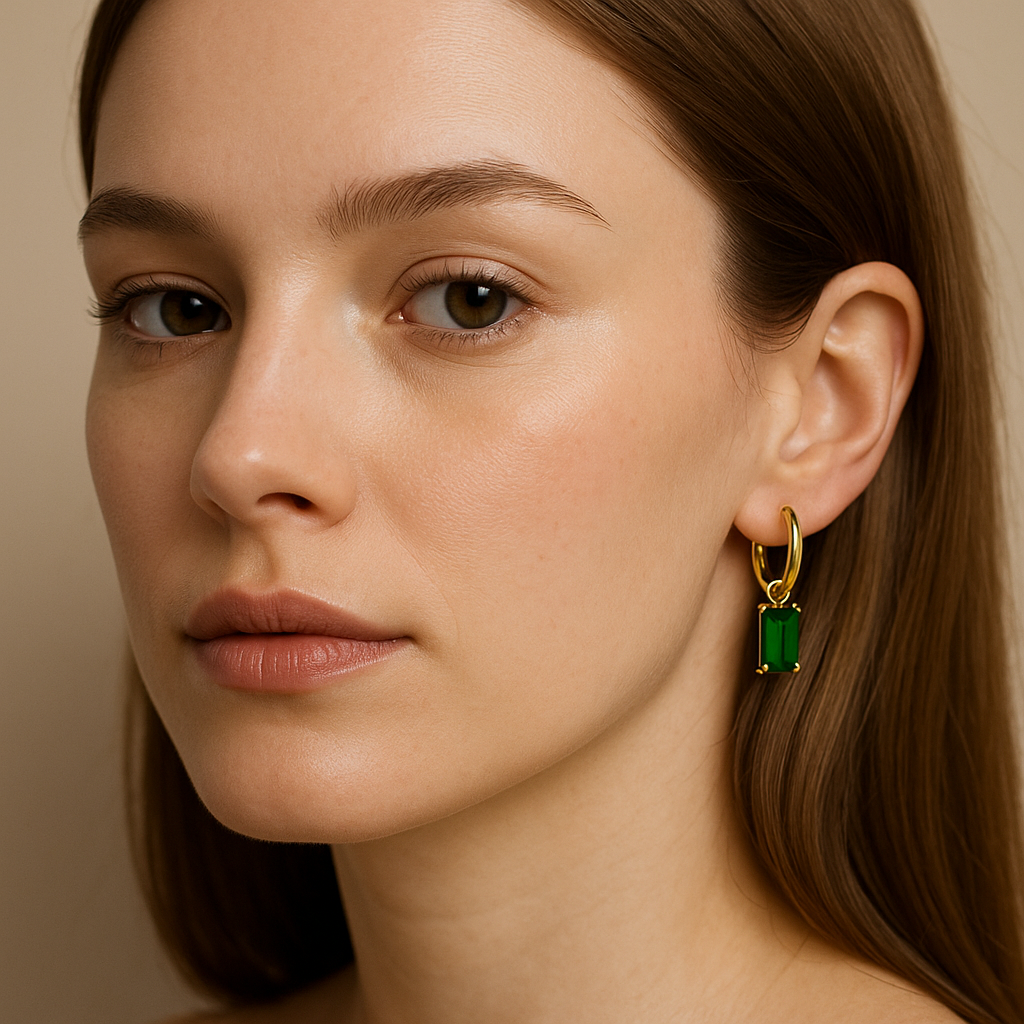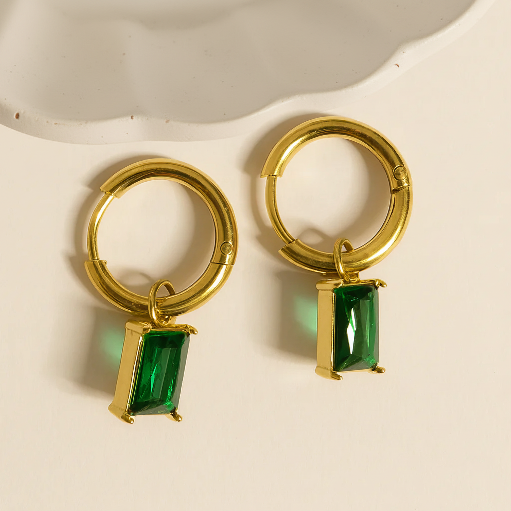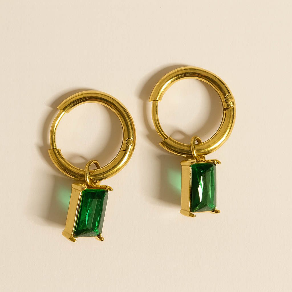 Elegant bali hoops featuring a captivating green square stone centerpiece for a unique, refined touch.  Crafted with anti-tarnish materials that promise a lasting shine and everyday durability.  Combines classic bali design with a modern geometric twist for a stylish and sophisticated statement.  Lightweight and comfortable for effortless all-day wear.