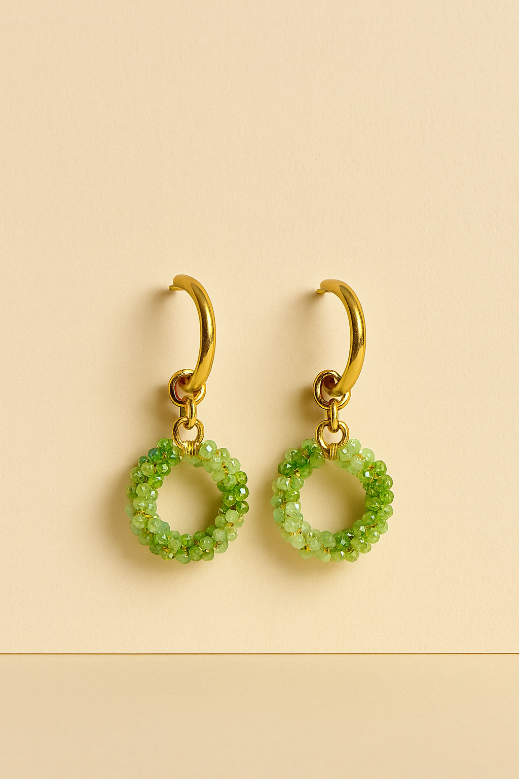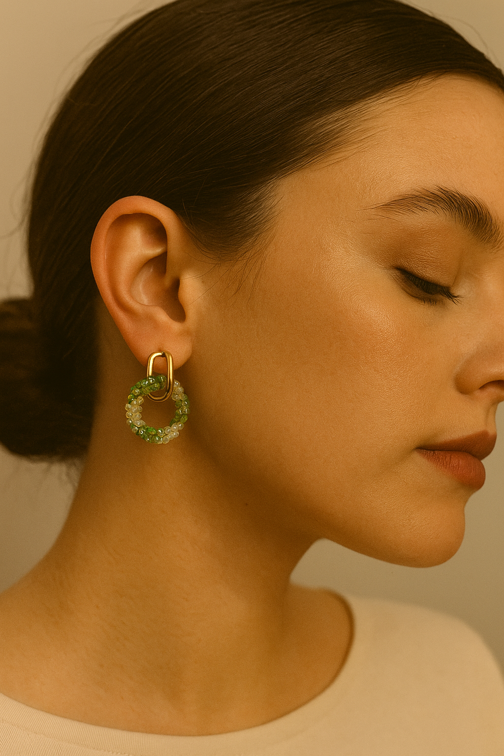 Elegant golden bali hoops accented with vibrant green circular beads for a fresh, eye-catching look. Crafted from high-quality, anti-tarnish materials to maintain long-lasting shine and durability. Classic bali design fused with contemporary bead detailing for a stylish and versatile accessory. Lightweight and comfortable, making them perfect for effortless all-day wear. Ideal for elevating both...