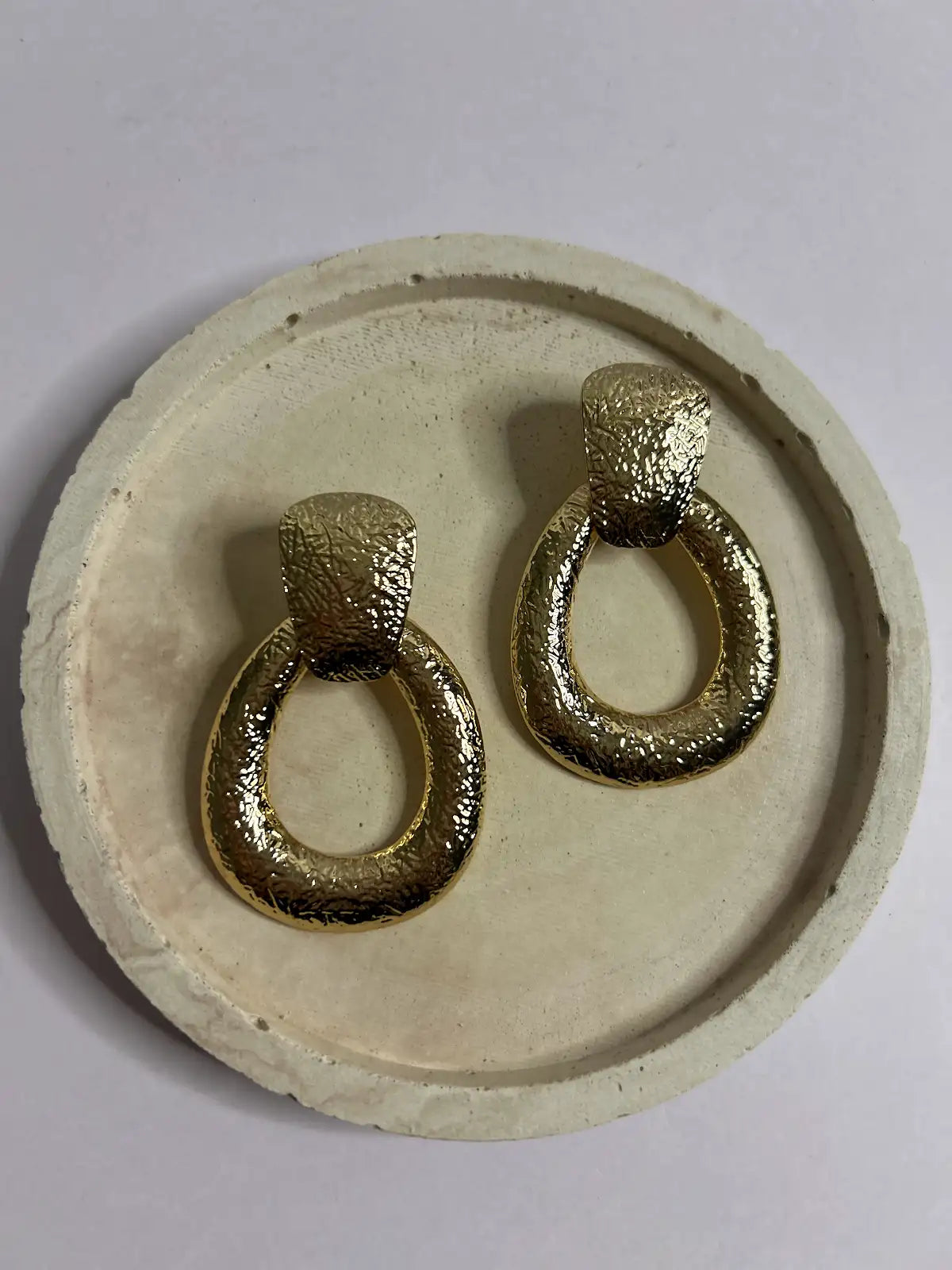 Bold golden dangle earrings crafted with a distinctive textured oval design that reflects light with a rich, artisanal finish.  Designed to make a statement at parties and special events, these earrings bring bold texture and golden radiance that effortlessly elevate any festive outfit.