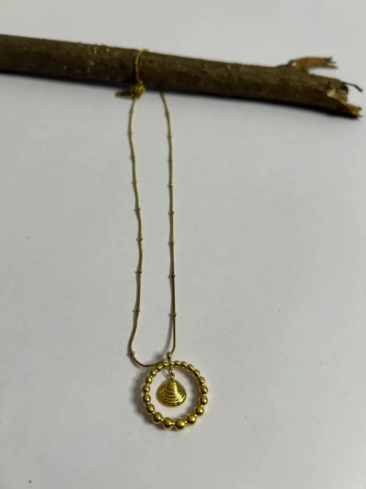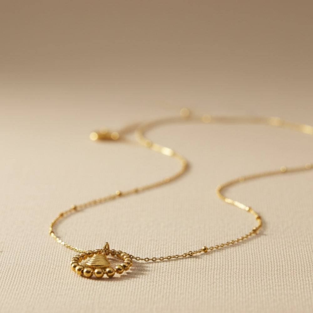 Minimalist gold pendant with a stunning shell set inside a polished circle on a classic chain. Radiates warm, beach-inspired charm with contemporary simplicity. Perfect for layering or as a solo statement piece. Crafted to be light and durable for daily elegance.