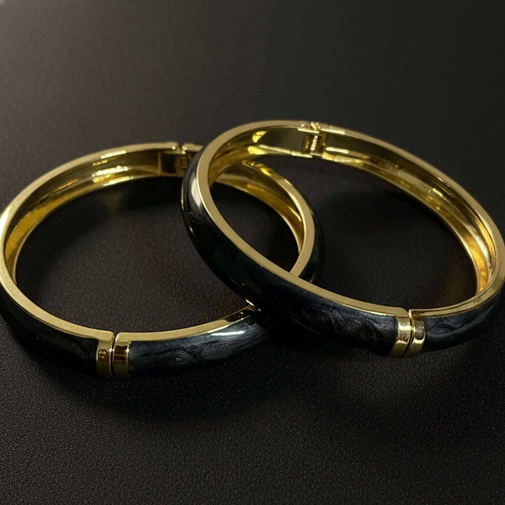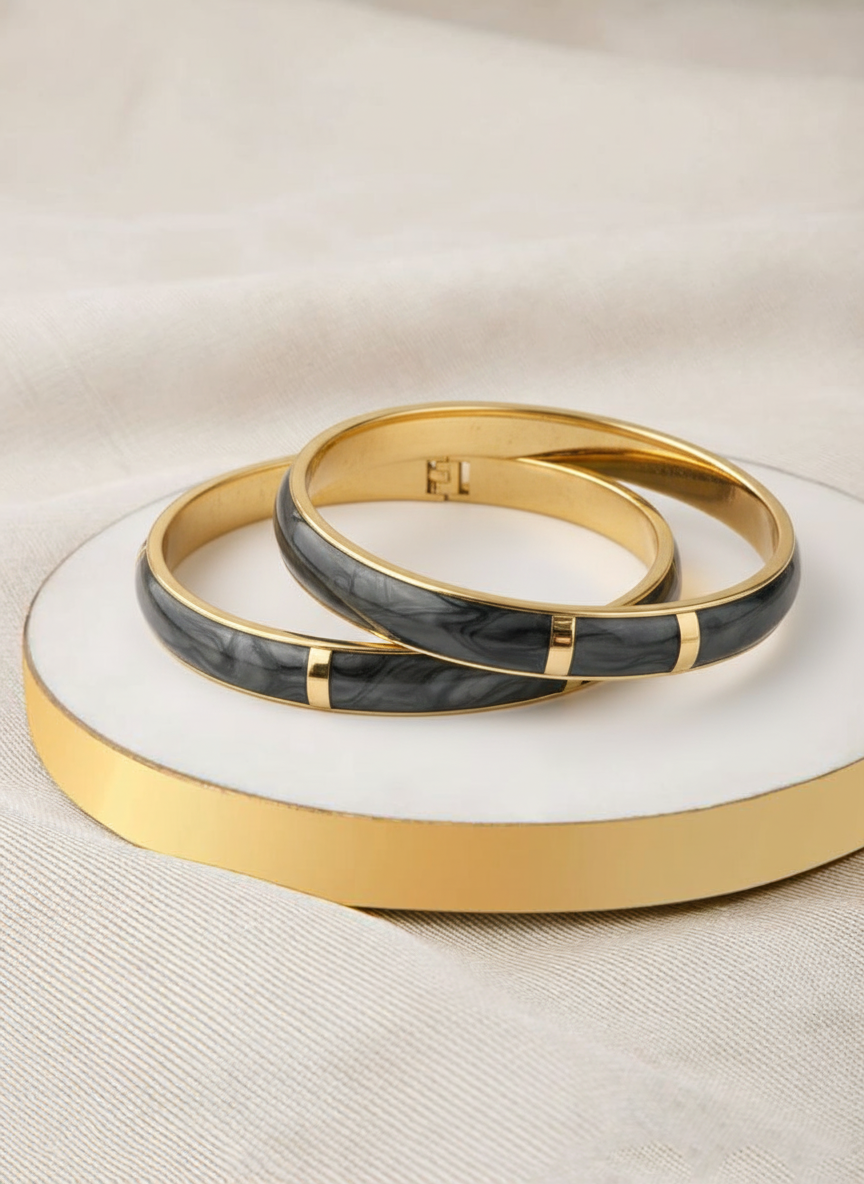 A stylish grey enamel kada with a secure hinged closure, equipped with a sturdy and easy-to-use clasp for a snug fit.  Combining contemporary style with comfortable functionality, it adds a subtle yet striking touch to any wrist.  Lightweight and versatile, perfect for daily wear or as a standalone statement piece.  An elegant accessory...