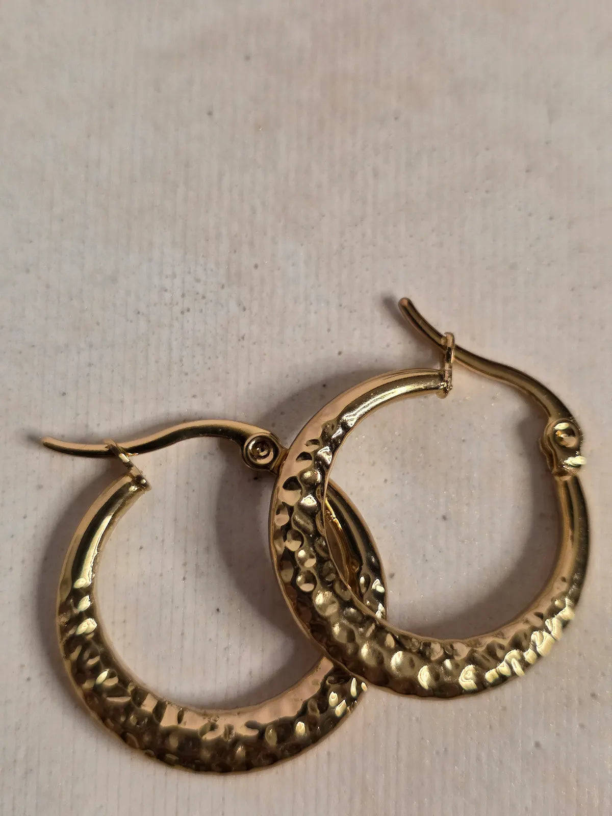 Stunning gold hoops with a handcrafted hammered finish Lightweight and designed for comfortable everyday wear Adds a bold, artisanal touch to any look Perfect for casual or dressy occasions Anti-tarnish coating ensures long-lasting shine and durability