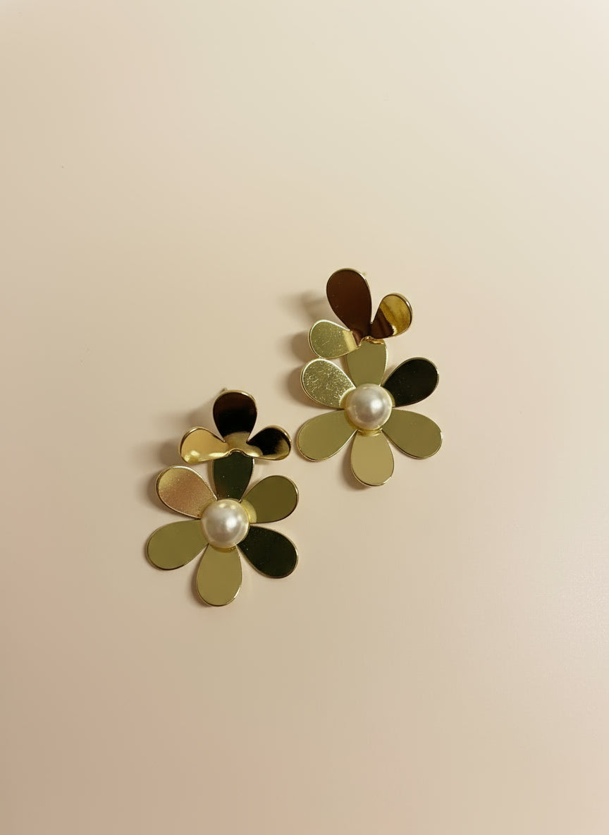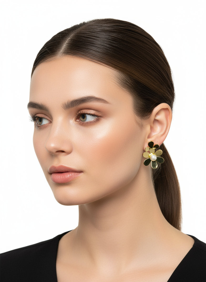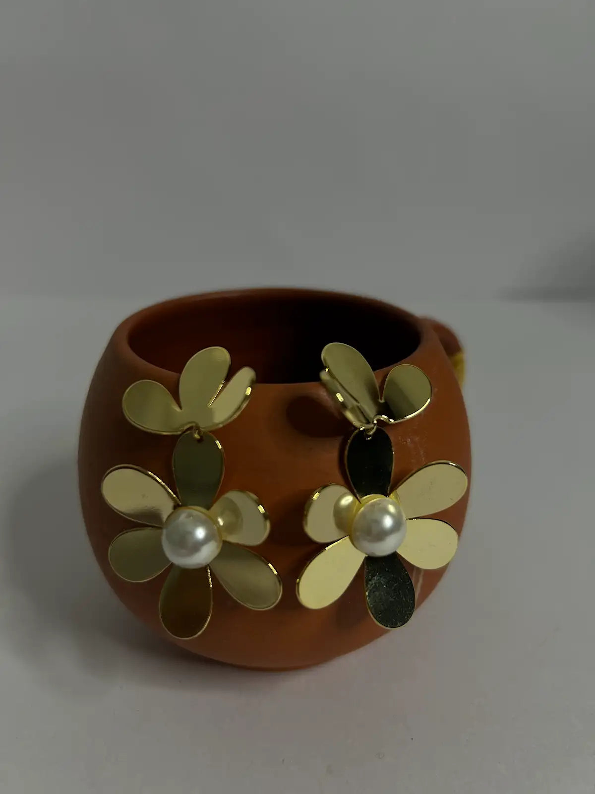 Crafted from high-quality materials with a radiant golden finish, enhancing the intricate floral details and the soft glow of the pearl.  The dangling blossoms add movement and charm, making these earrings perfect for special occasions and romantic settings.  Lightweight and comfortable, designed to complement both traditional and contemporary styles with effortless elegance.