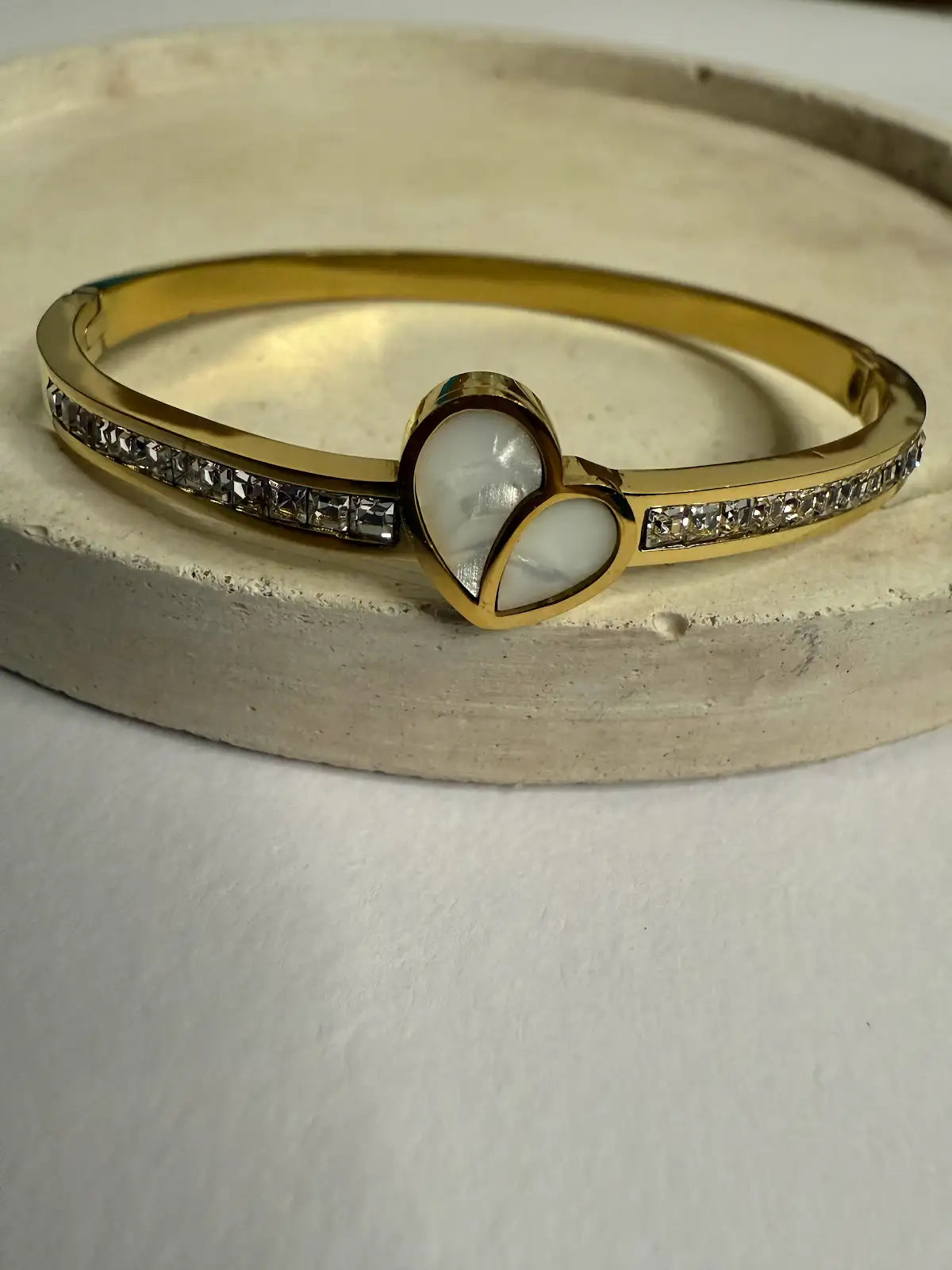 Beautiful golden kada featuring a series of delicate hearts inlaid with lustrous white enamel, creating a charming and elegant design. The openwork pattern allows light to play through, enhancing the shine and adding a touch of romance. Lightweight and comfortable, perfect for everyday wear or special occasions. Finished with an anti-tarnish coating to...