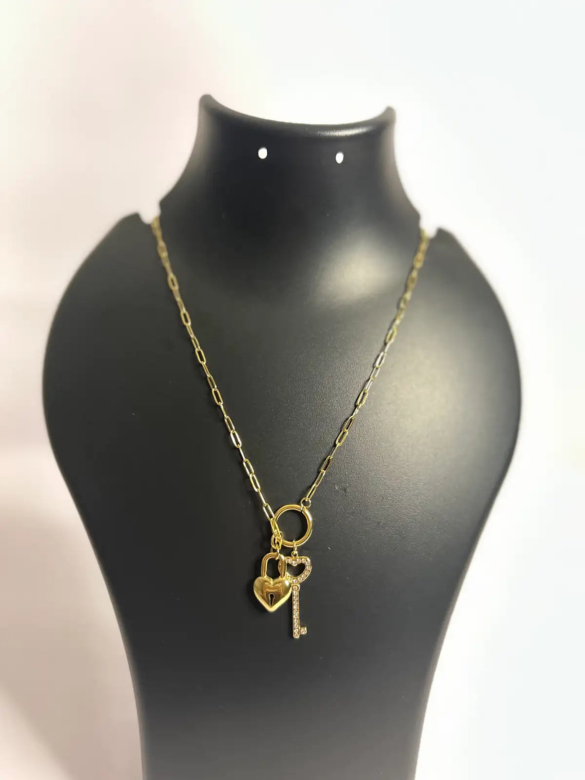 Stylish golden chain with intricately crafted heart lock and key charms. Lightweight and versatile for effortless everyday wear or special occasions. Perfect for gifting to symbolize love and devotion.