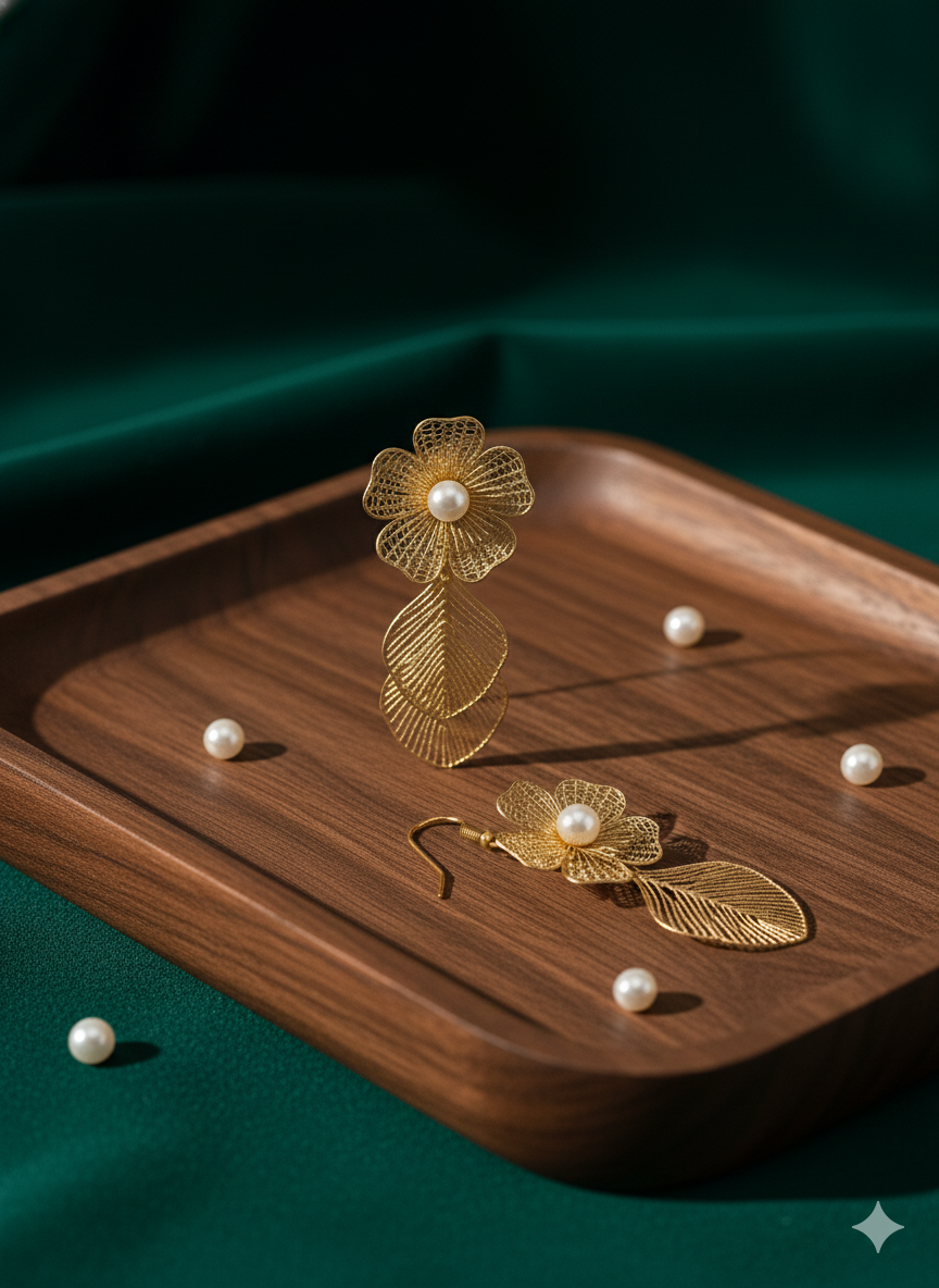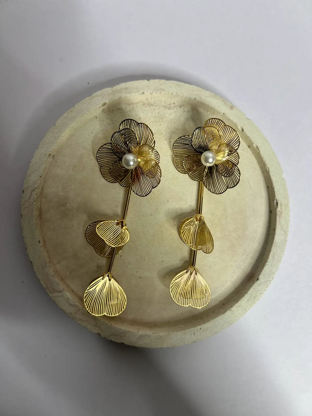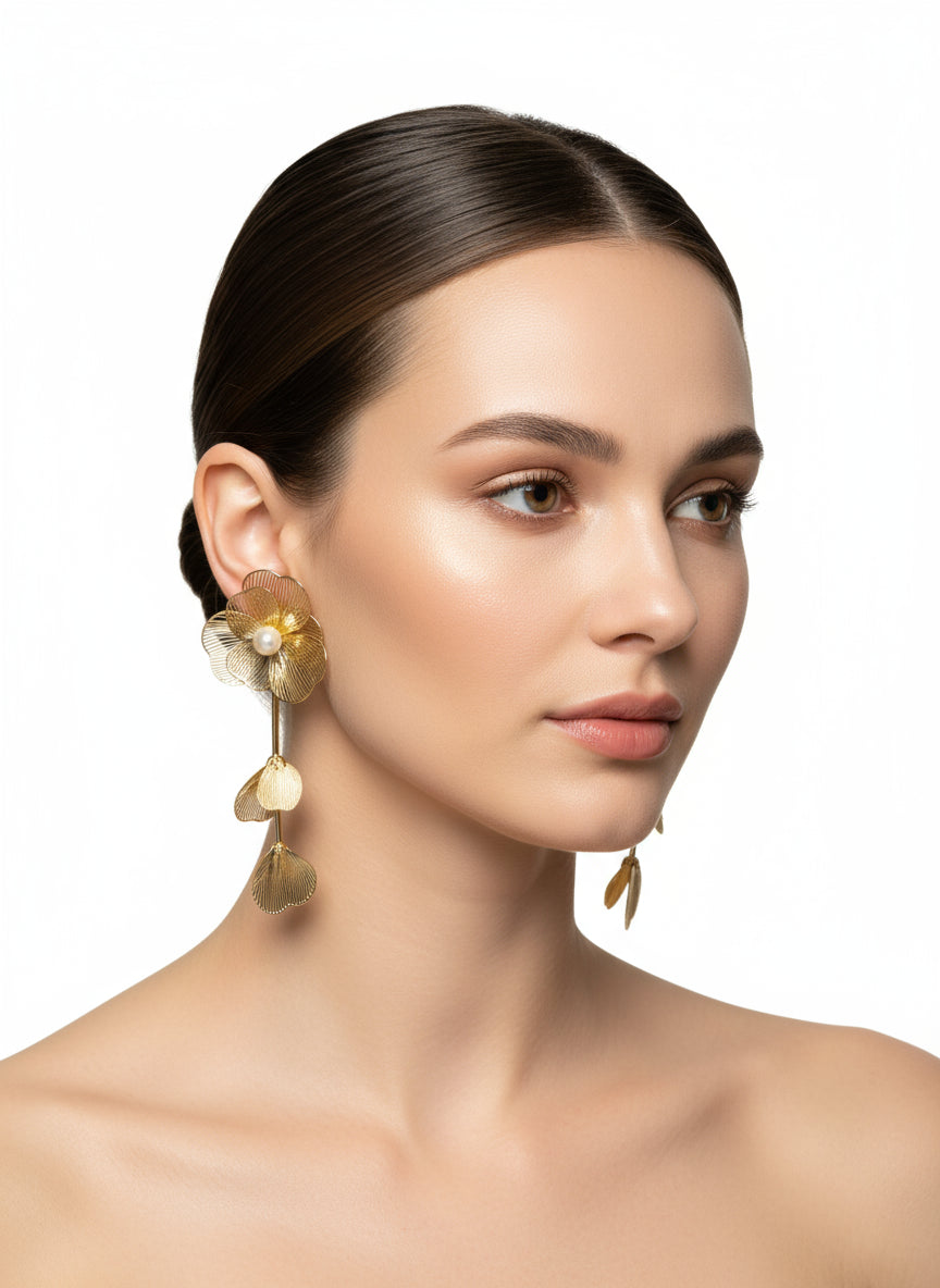 Delicate earrings featuring a beautifully crafted flower design with hanging petals and a single lustrous pearl at the center, adding a touch of timeless elegance.  The hanging petals offer graceful movement, making these earrings perfect for special occasions and sophisticated everyday wear.  Lightweight and comfortable, these earrings are perfect for elevating party...