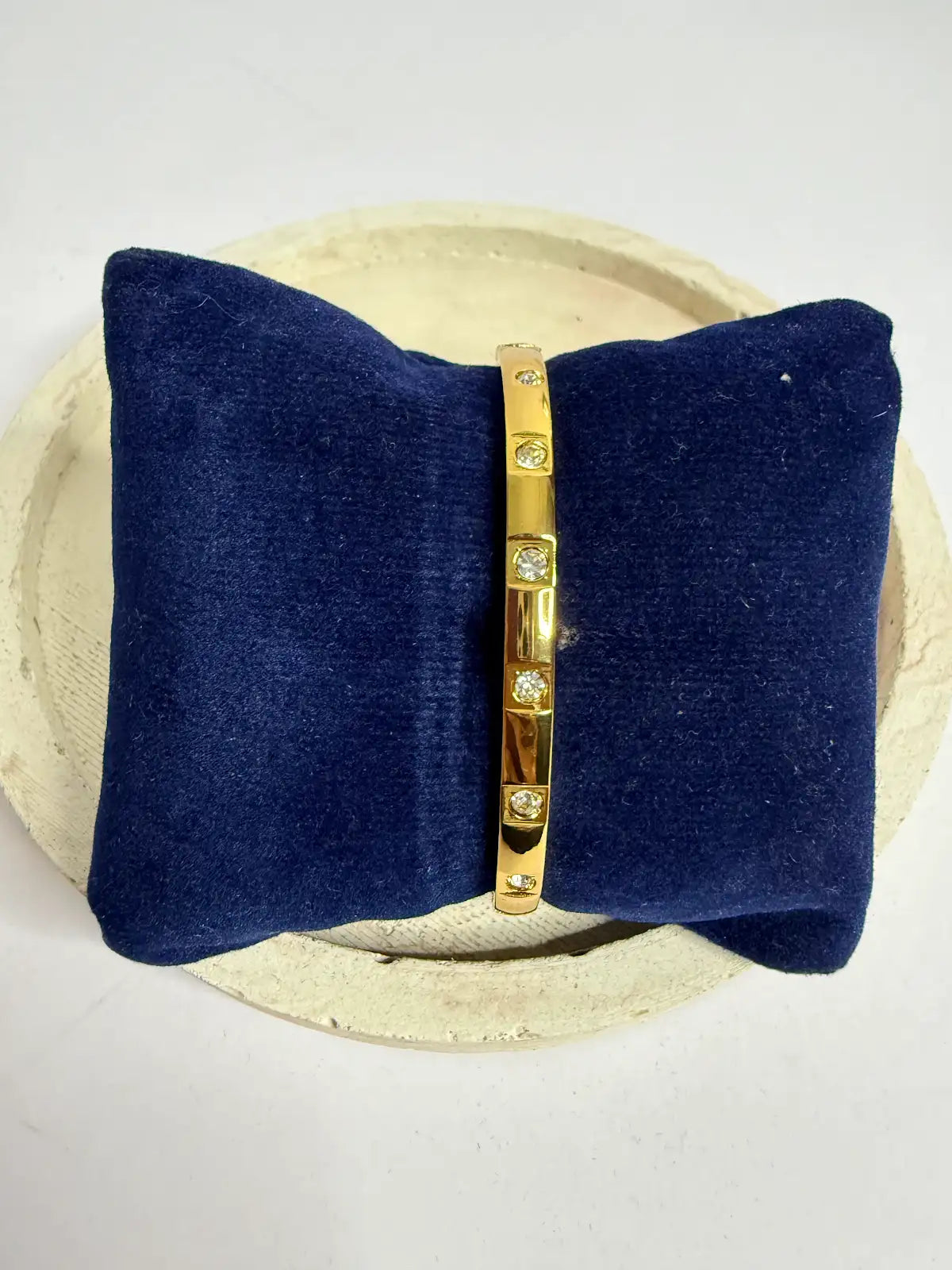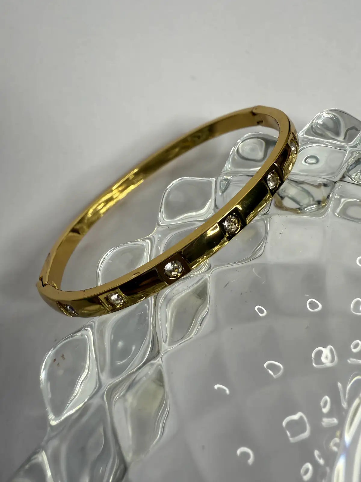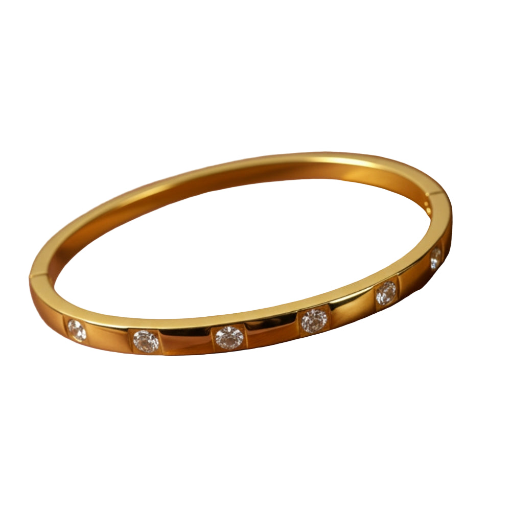 Delicately crafted thin golden bracelet featuring a single sparkling diamond for understated elegance. Minimalist design highlights the beauty of simplicity with a luxurious touch of brilliance. Lightweight and comfortable, perfect for stacking or wearing alone as a subtle statement. Finished with an anti-tarnish coating to ensure lasting shine and resilience.