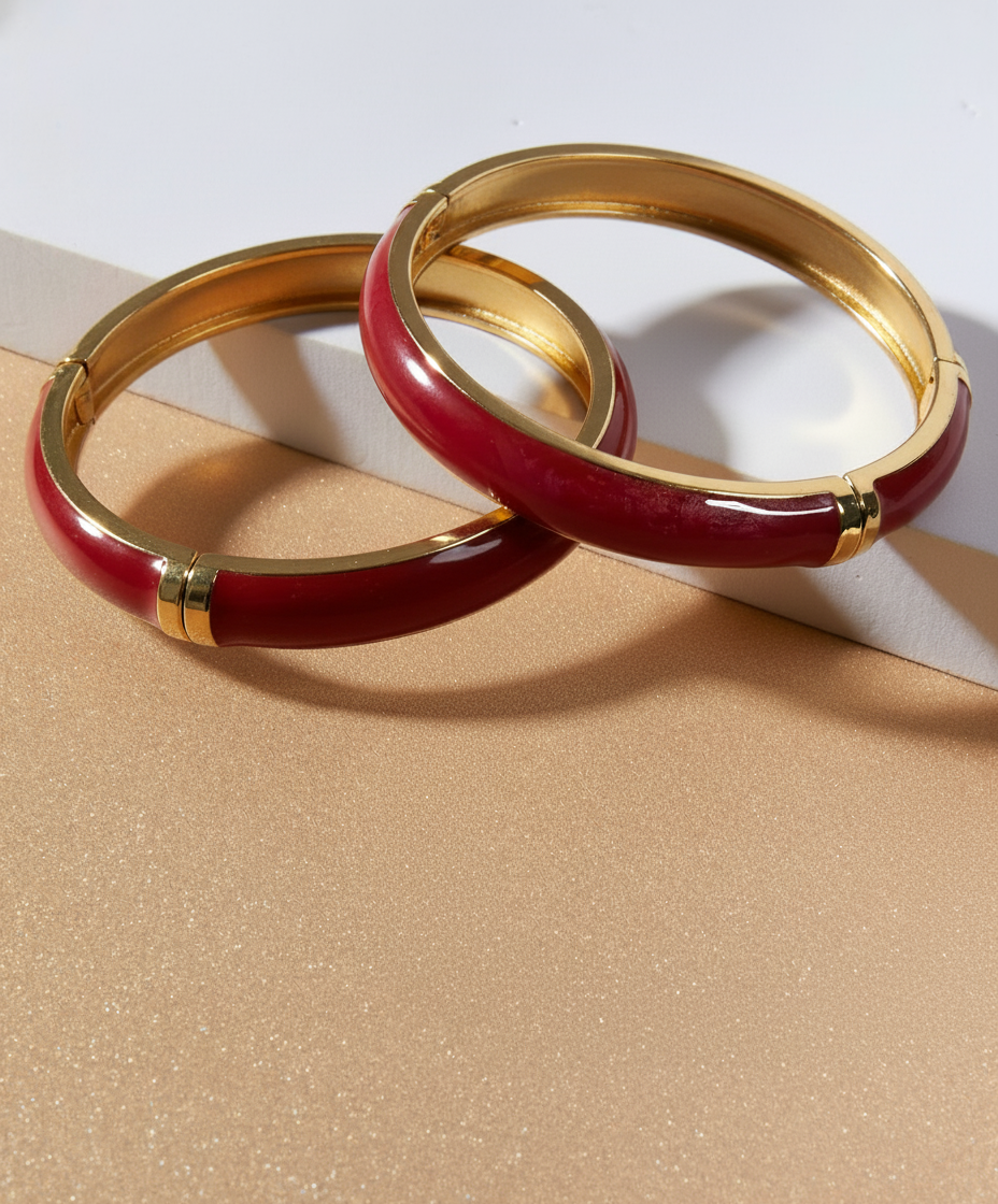 A stylish pink enamel kada with a secure hinged closure, equipped with a sturdy and easy-to-use clasp for a snug fit.  Combining contemporary style with comfortable functionality, it adds a subtle yet striking touch to any wrist.  Lightweight and versatile, perfect for daily wear or as a standalone statement piece.  An elegant accessory...