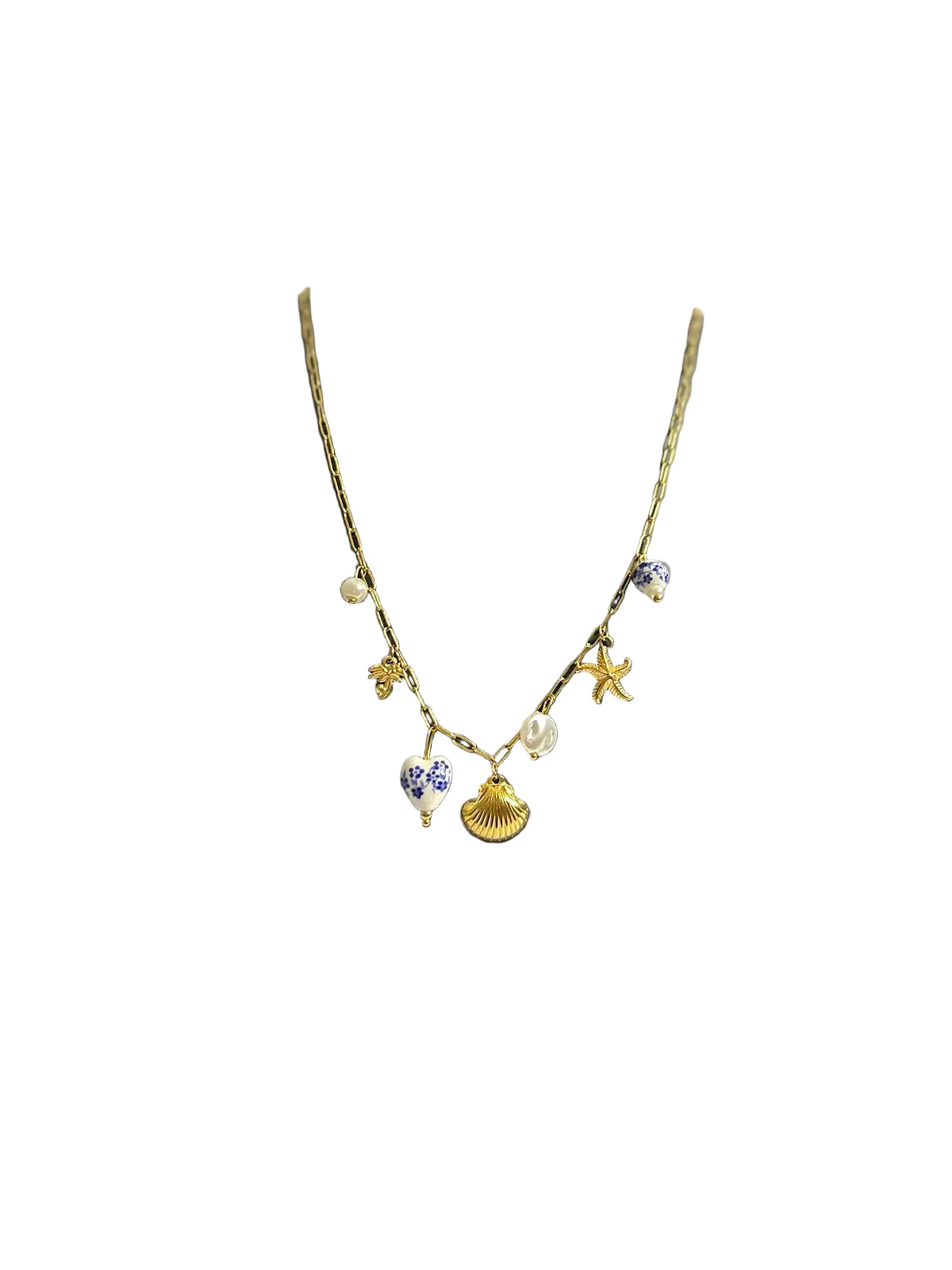 Clean, modern design with gold chain accented by petite heart and starfish shell charms. Eye-catching charm combo for the perfect poolside or vacation look. Crafted to be lightweight and easy to wear, wherever the tide takes you.