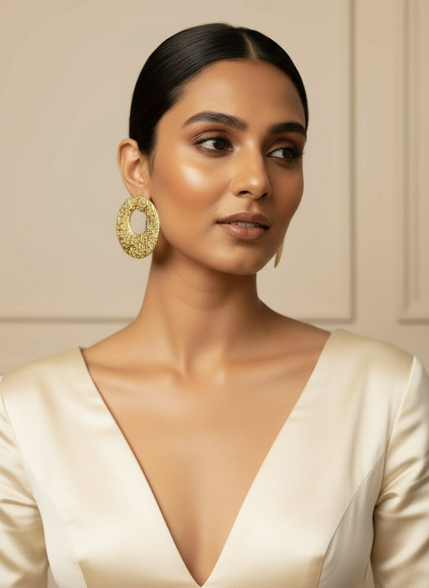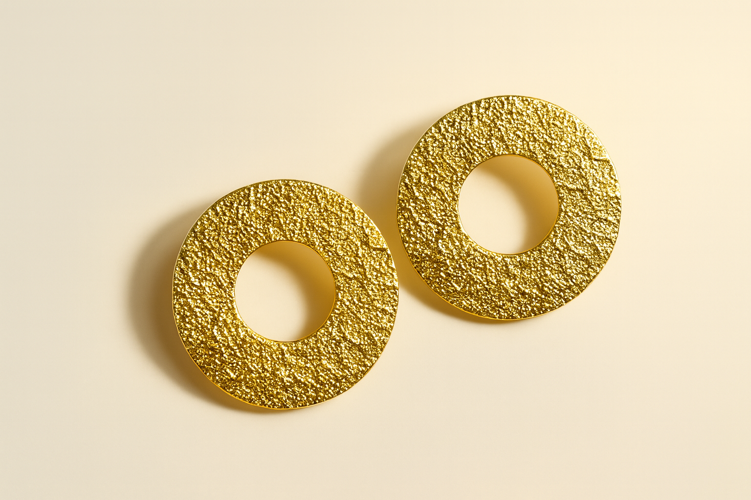 Elegant earrings featuring a single large golden textured circle that makes a bold, stylish statement.  Crafted with premium materials to ensure a radiant, long-lasting finish.  A versatile statement piece that can be worn solo or paired with minimal accessories for an elegant look.  Perfect for those who appreciate contemporary designs with unique texture...