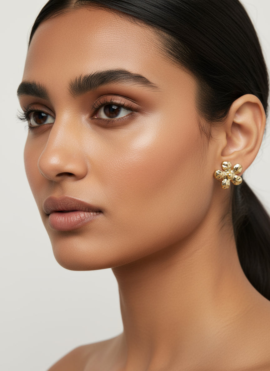 Elegant earrings showcasing a beautifully crafted textured flower design in a rich golden tone.  Features five delicately sculpted petals that add depth and visual interest to the piece.  Made from premium materials, offering a radiant, long-lasting finish that resists tarnishing.  Lightweight and comfortable, perfect for all-day wear with a touch of refined femininity.  Adds...