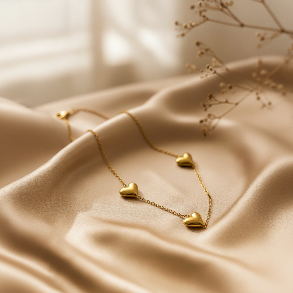Stylish single chain bracelet featuring three distinct golden hearts spaced evenly to highlight romantic elegance. Lightweight and elegant, this bracelet pairs effortlessly with any outfit, adding a touch of delicate glamour.